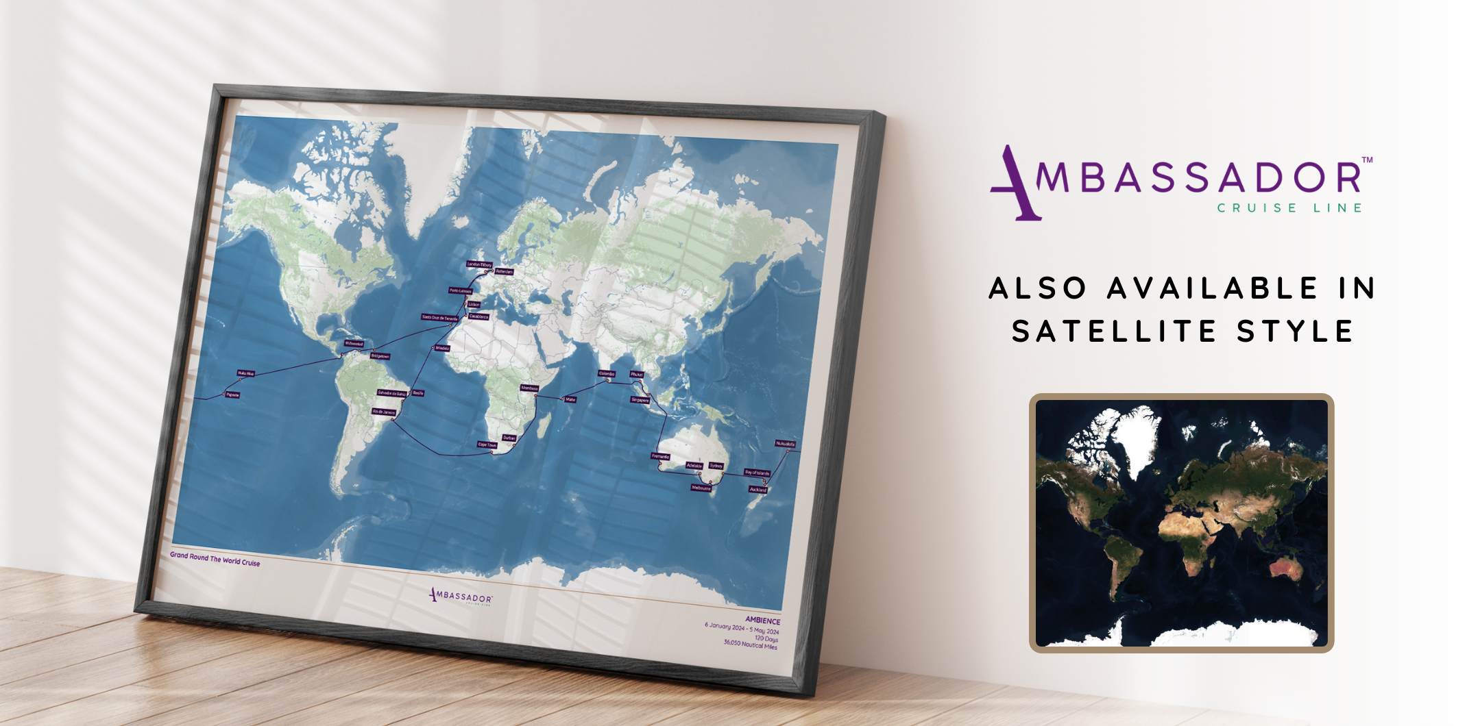 Create a beautiful customised print map of your exact Ambassador cruise. Each map is made to order using AIS (satellite ship-tracking) data to show where you actually went, rather than just the itinerary route.