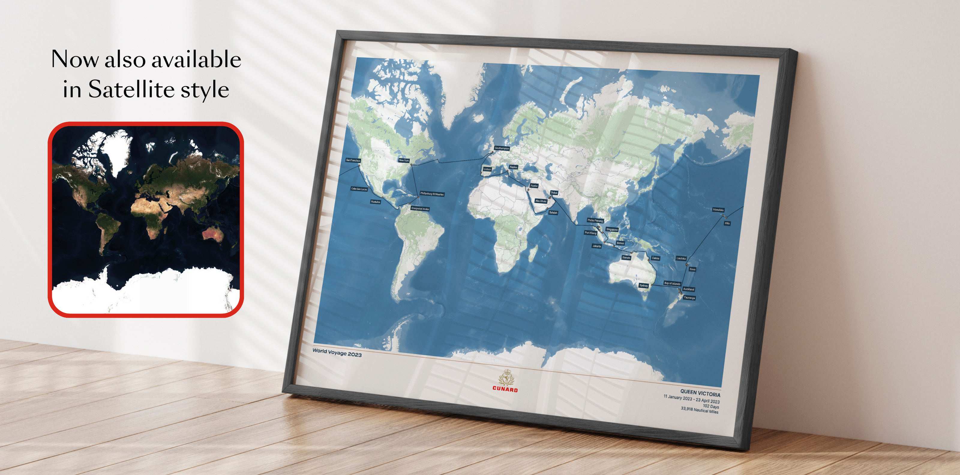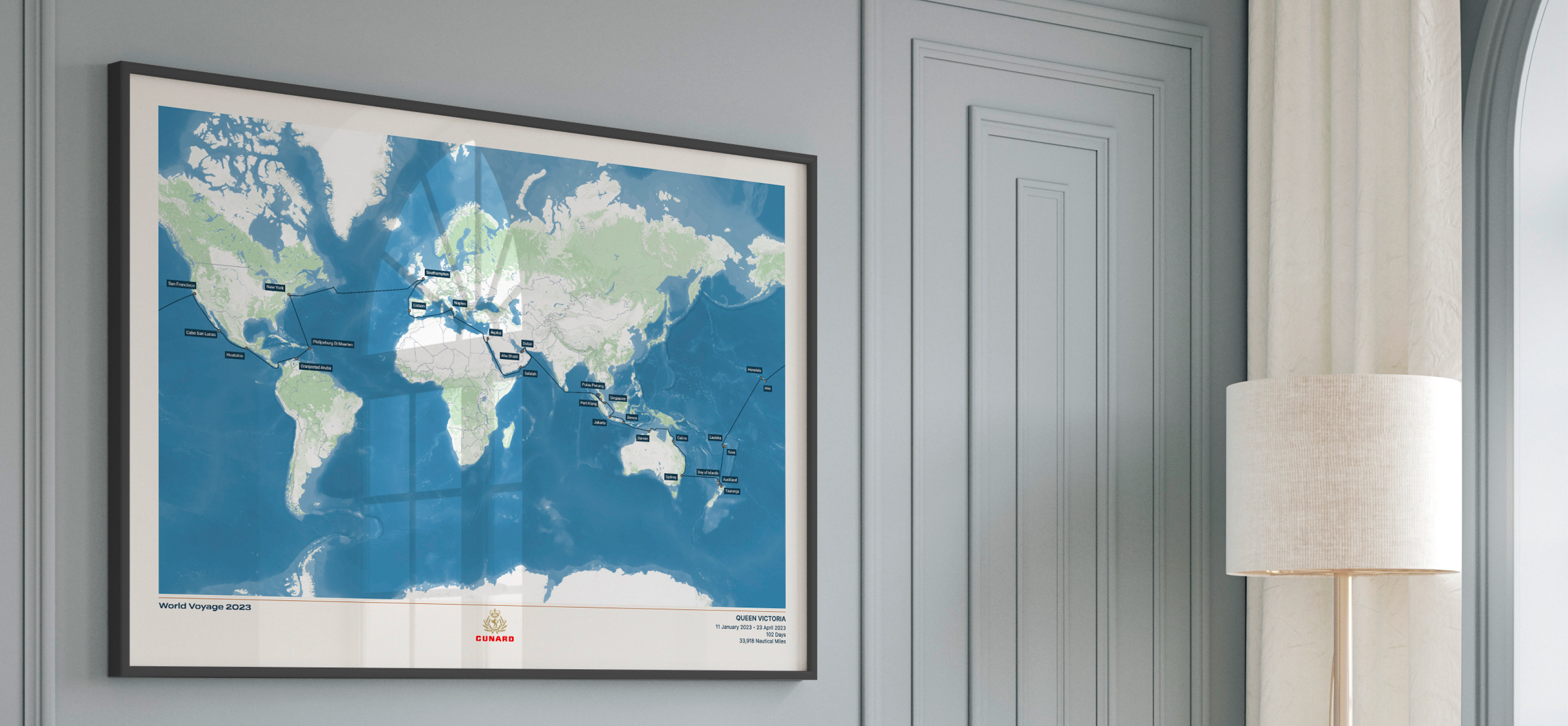 Cunard has partnered with The Cruise Maps to make custom print maps of your special voyage. By using AIS data from Cunard ships, these maps represent your exact route.