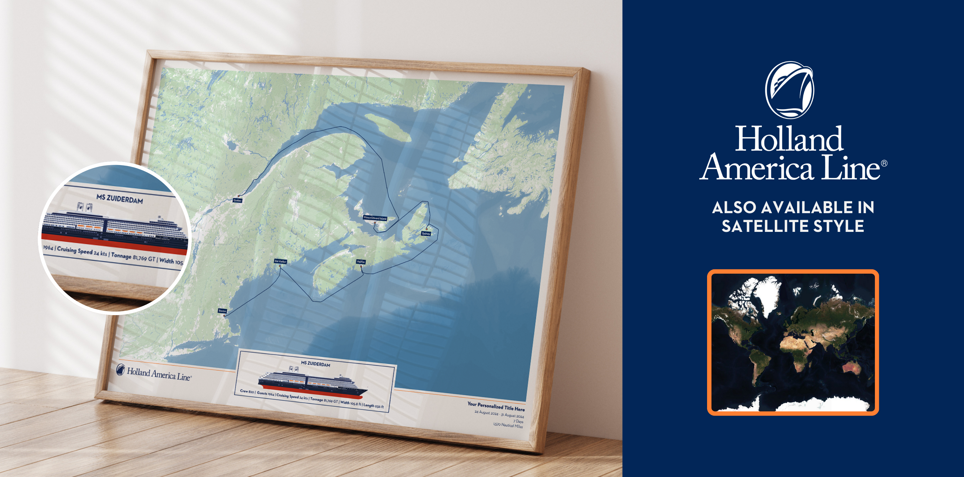 Holland America Line has partnered with The Cruise Maps to make custom print maps of your special cruise. By using AIS data from Holland America ships, these maps represent your exact route.