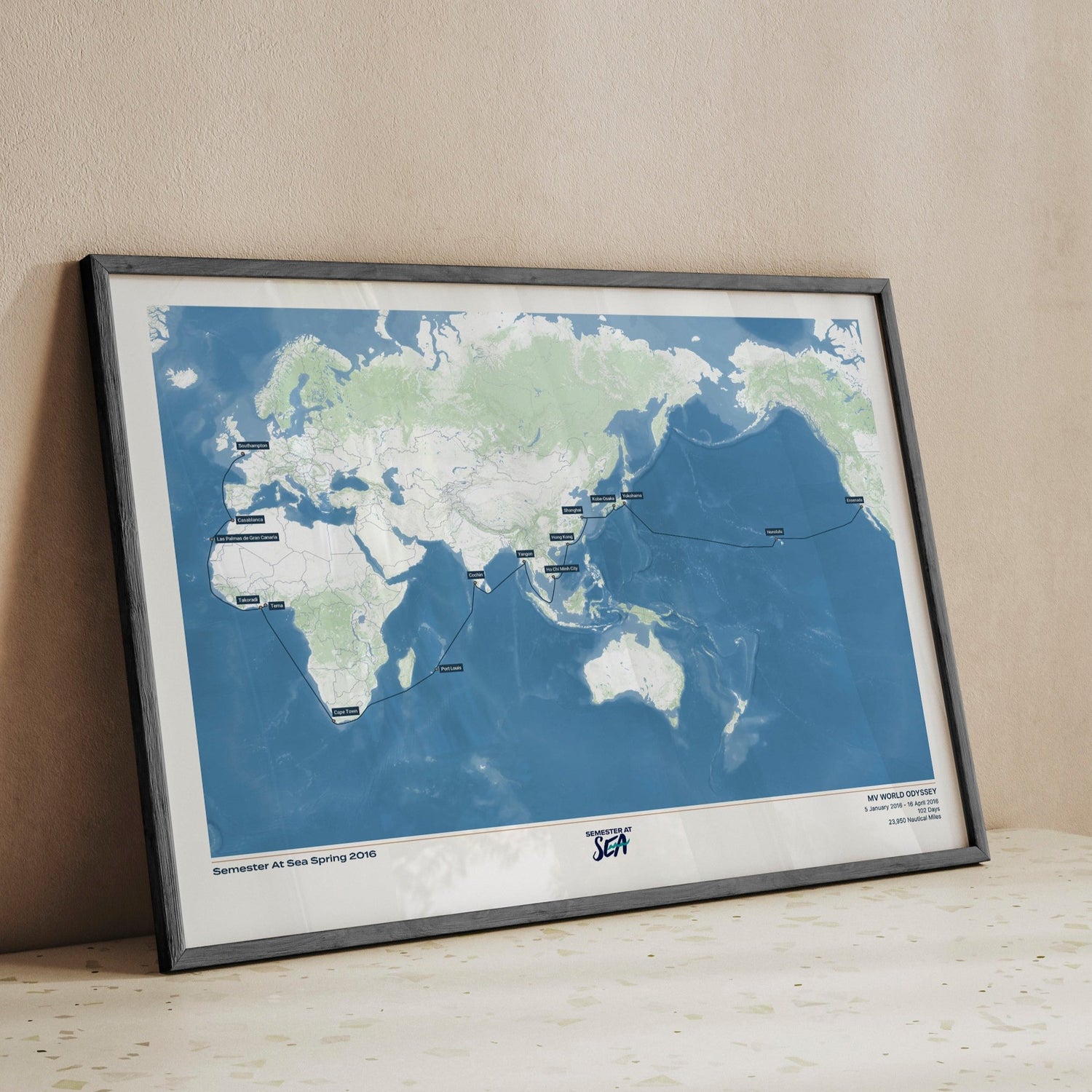 Create a beautiful customised print map of your exact Semester At Sea. Each map is made to order using AIS (satellite ship-tracking) data to show where you actually went, rather than just the itinerary route. Select your voyage, give your map a title, and we'll do the rest.
