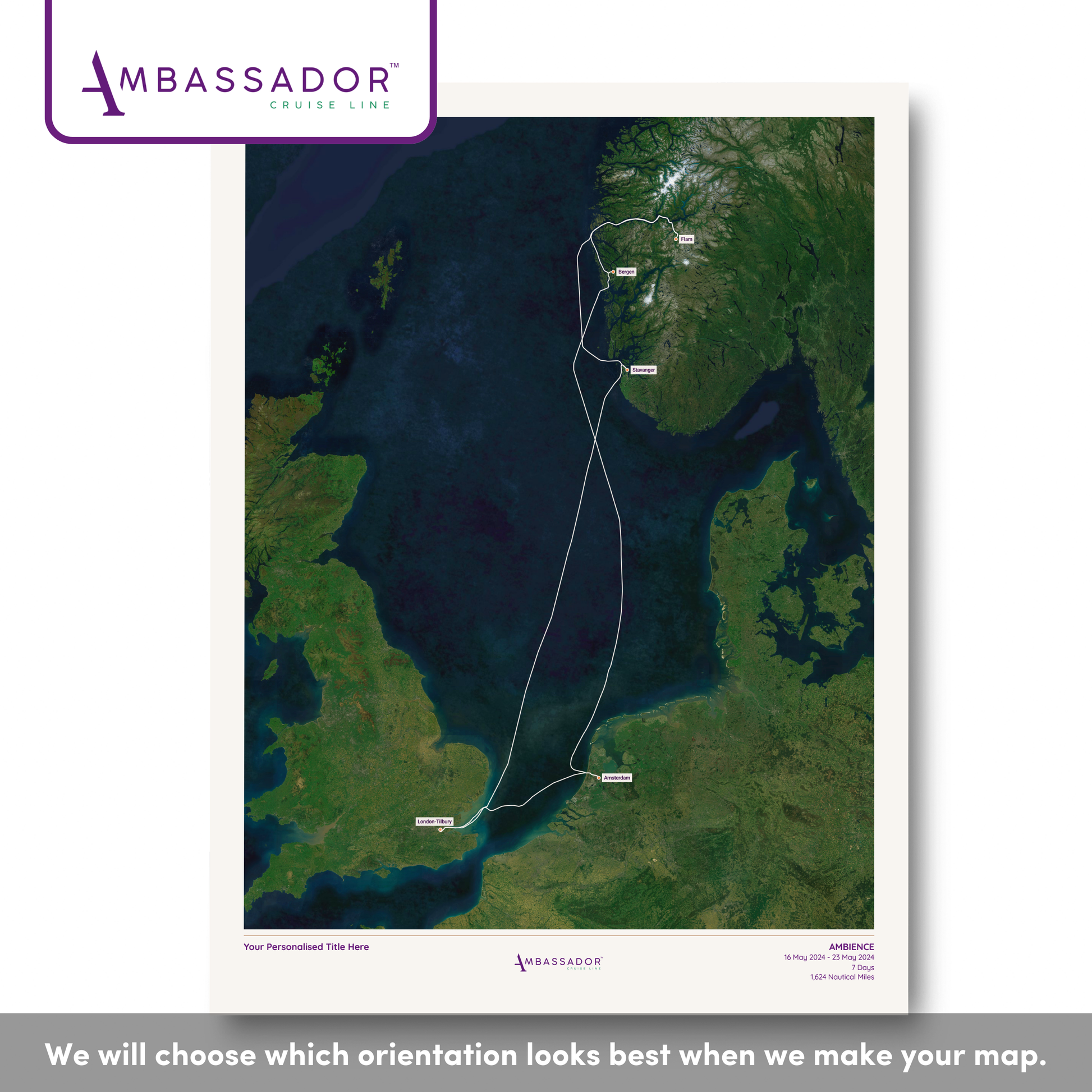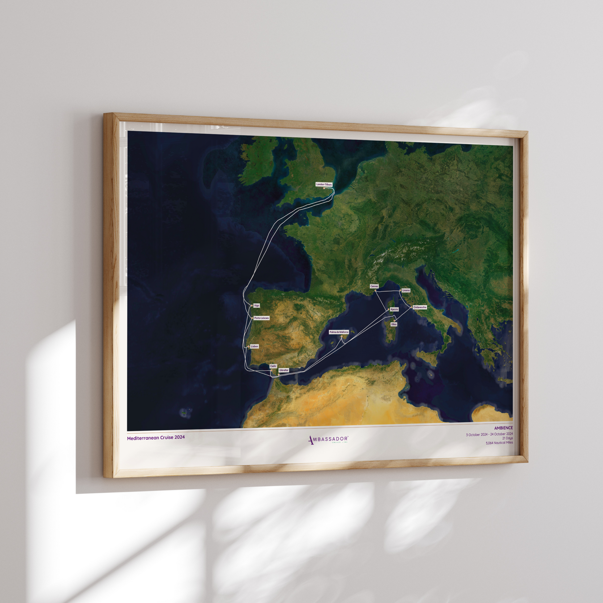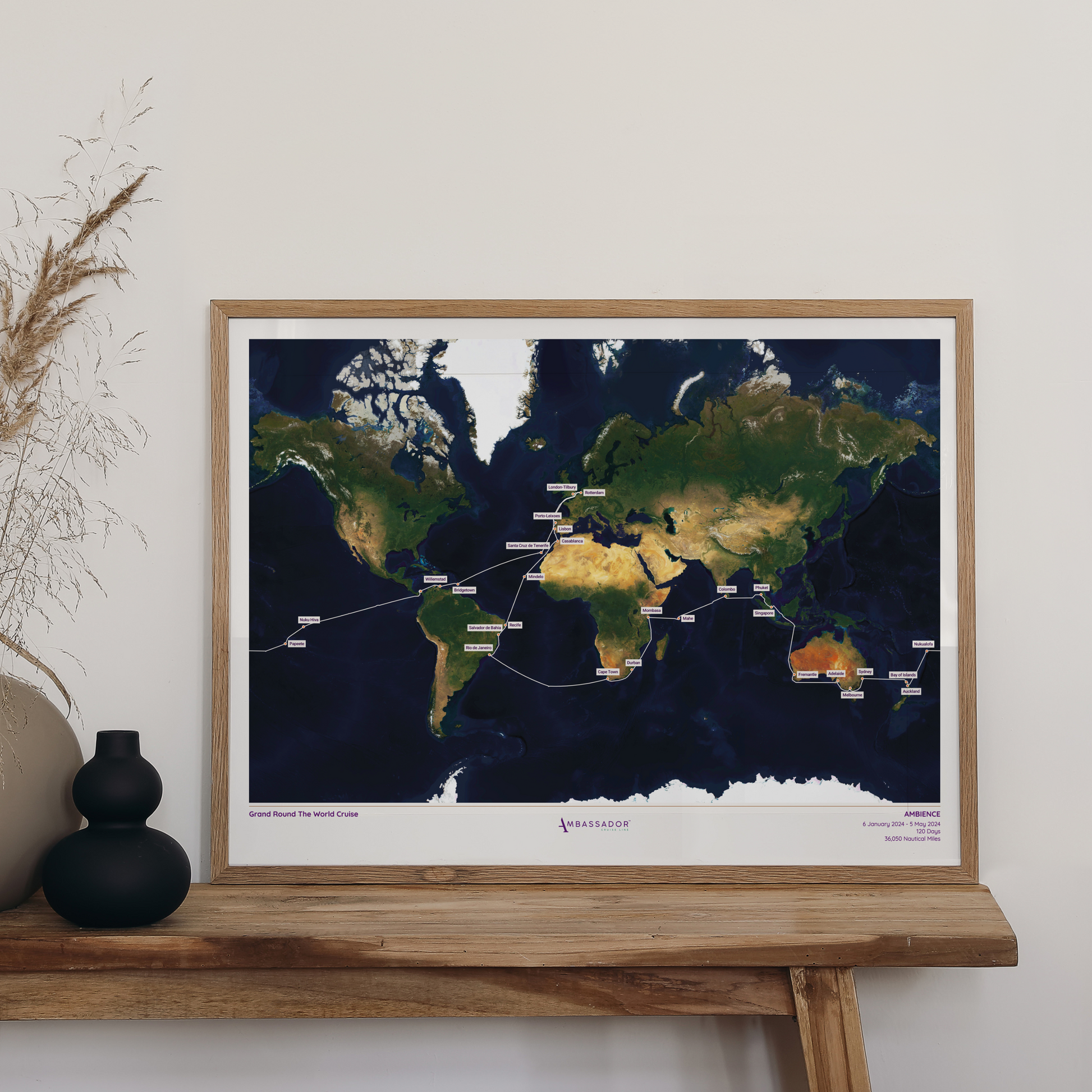 Create a beautiful customised print map of your exact Ambassador cruise. Each map is made to order using AIS (satellite ship-tracking) data to show where you actually went, rather than just the itinerary route. Select your Ambassador ship along with embarkation and disembarkation points and we'll do the rest.
