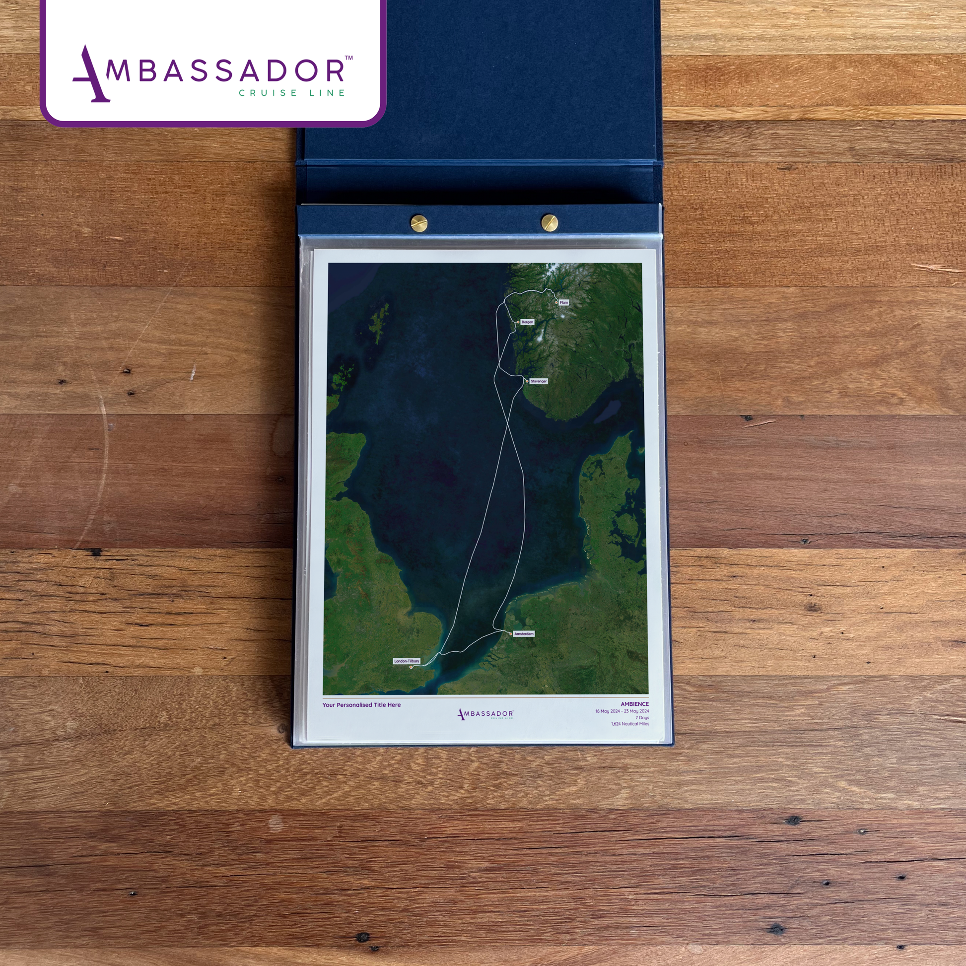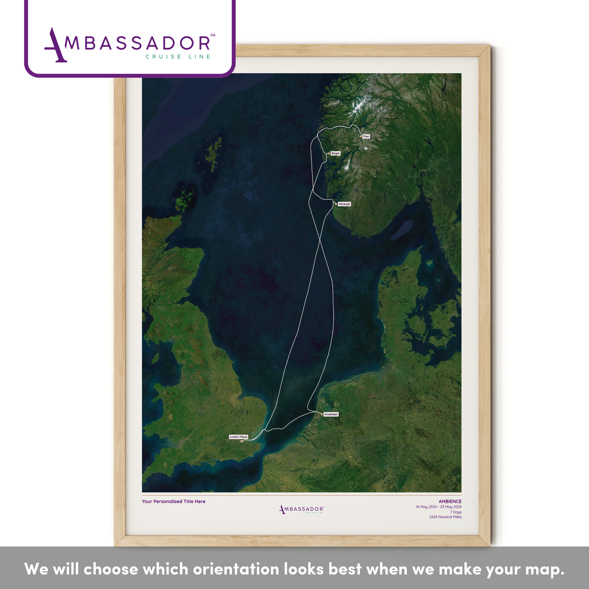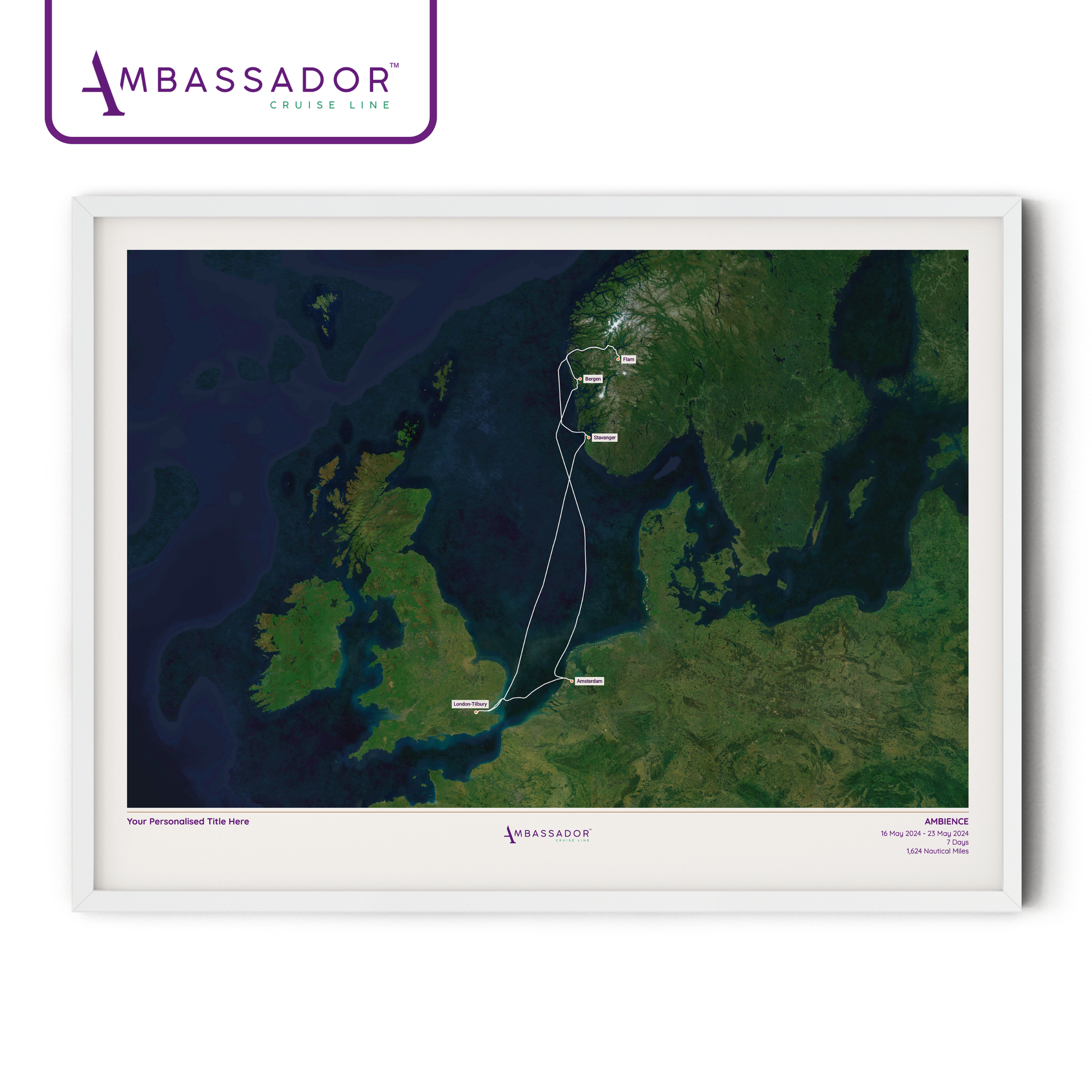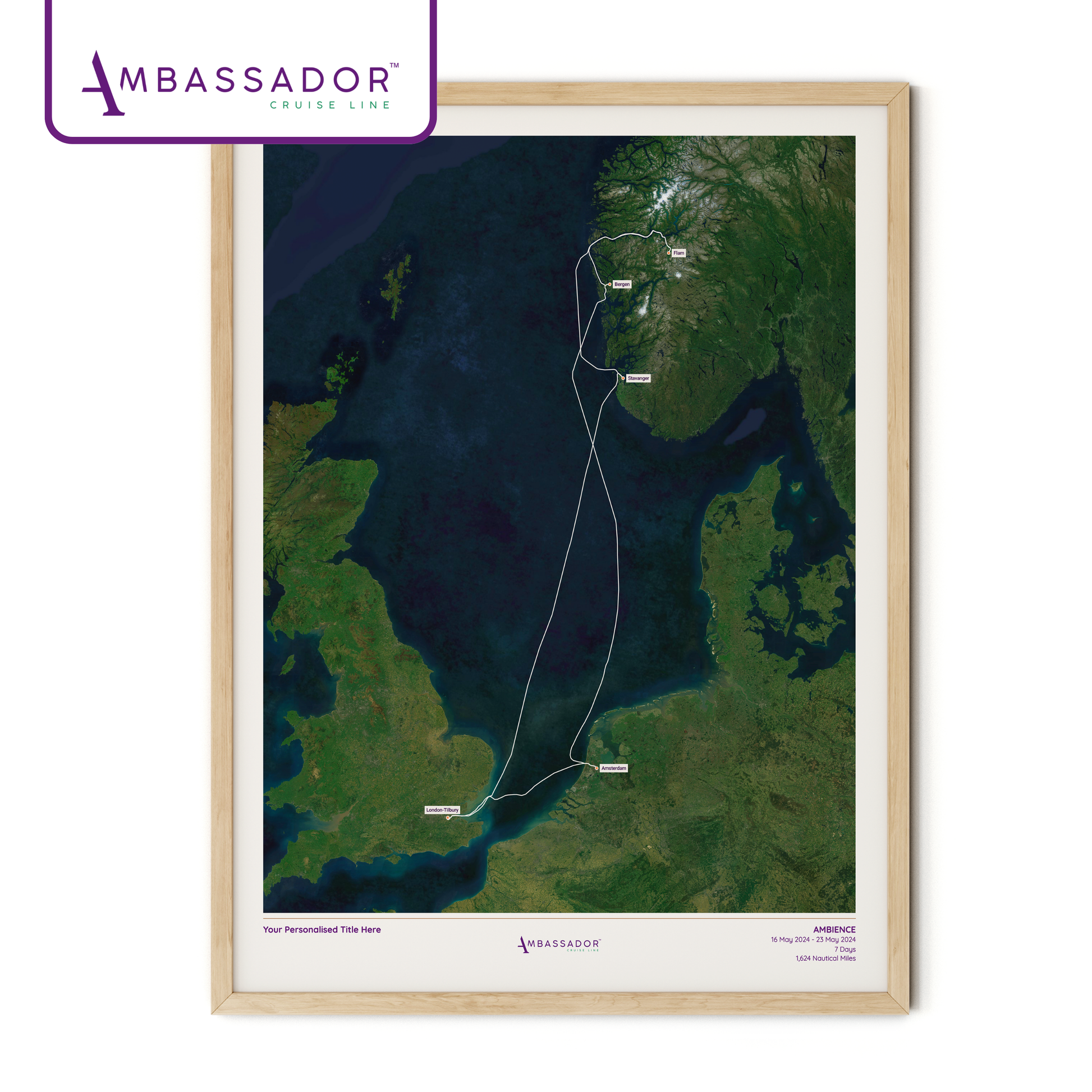 Create a beautiful customised print map of your exact Ambassador cruise. Each map is made to order using AIS (satellite ship-tracking) data to show where you actually went, rather than just the itinerary route. Select your Ambassador ship along with embarkation and disembarkation points and we'll do the rest.