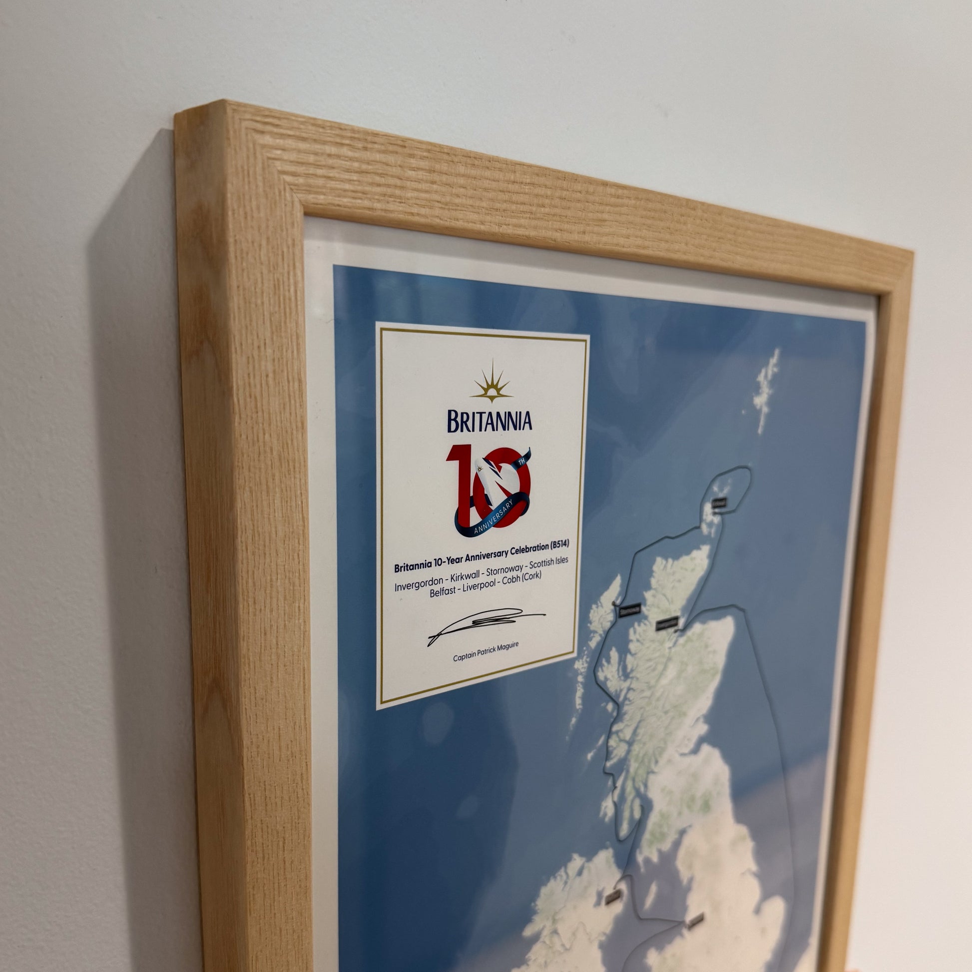 The exclusive and official cruise map of Britannia's 10-Year Anniversary Celebration Cruise. This limited edition print map is made using AIS tracking data from the ship in order to show the exact route of the voyage. Only 200 prints will be made in total. Each print is numbered, and is a unique piece of P&O Cruises history, bearing the official 10th anniversary logo and the signature of Captain Patrick Maguire.
