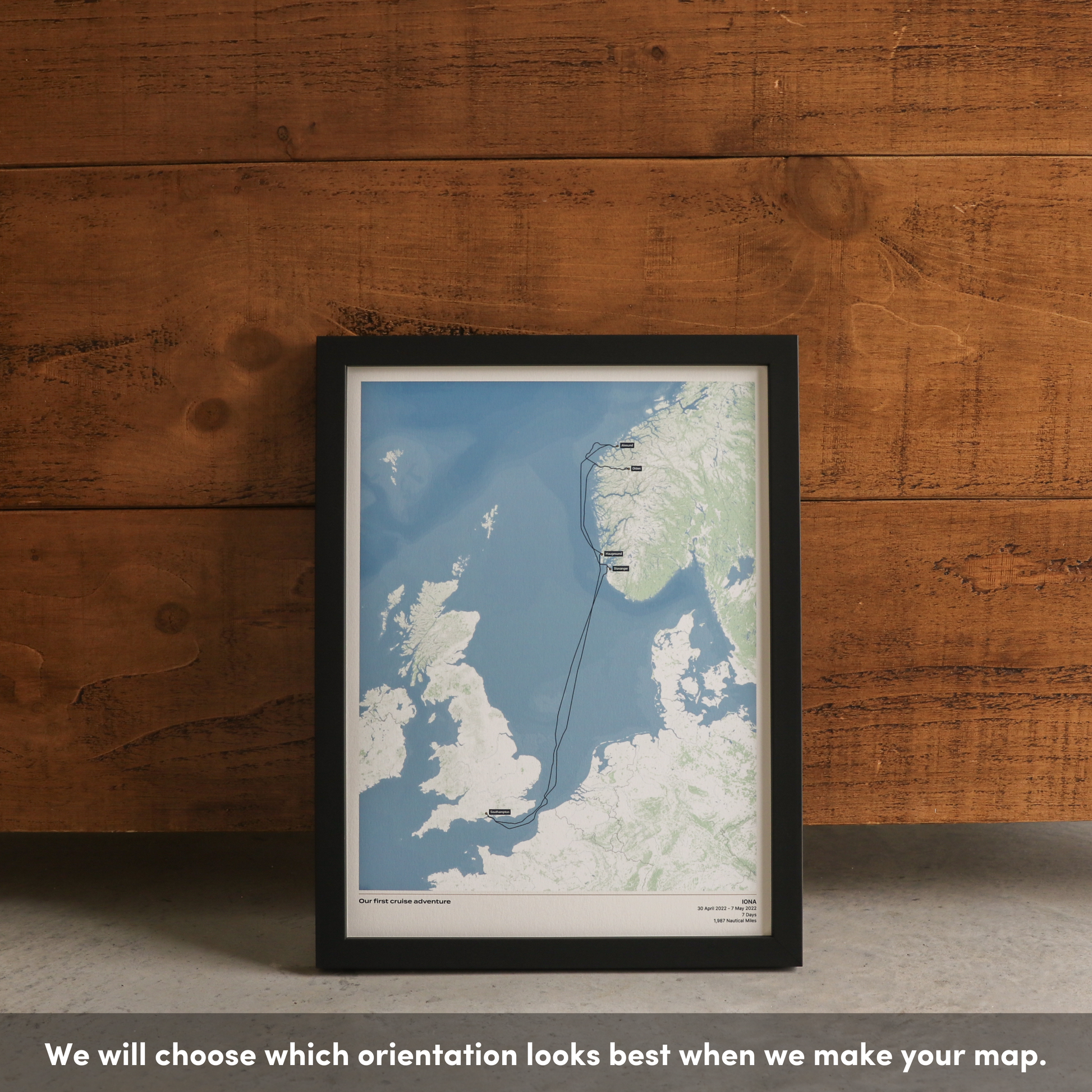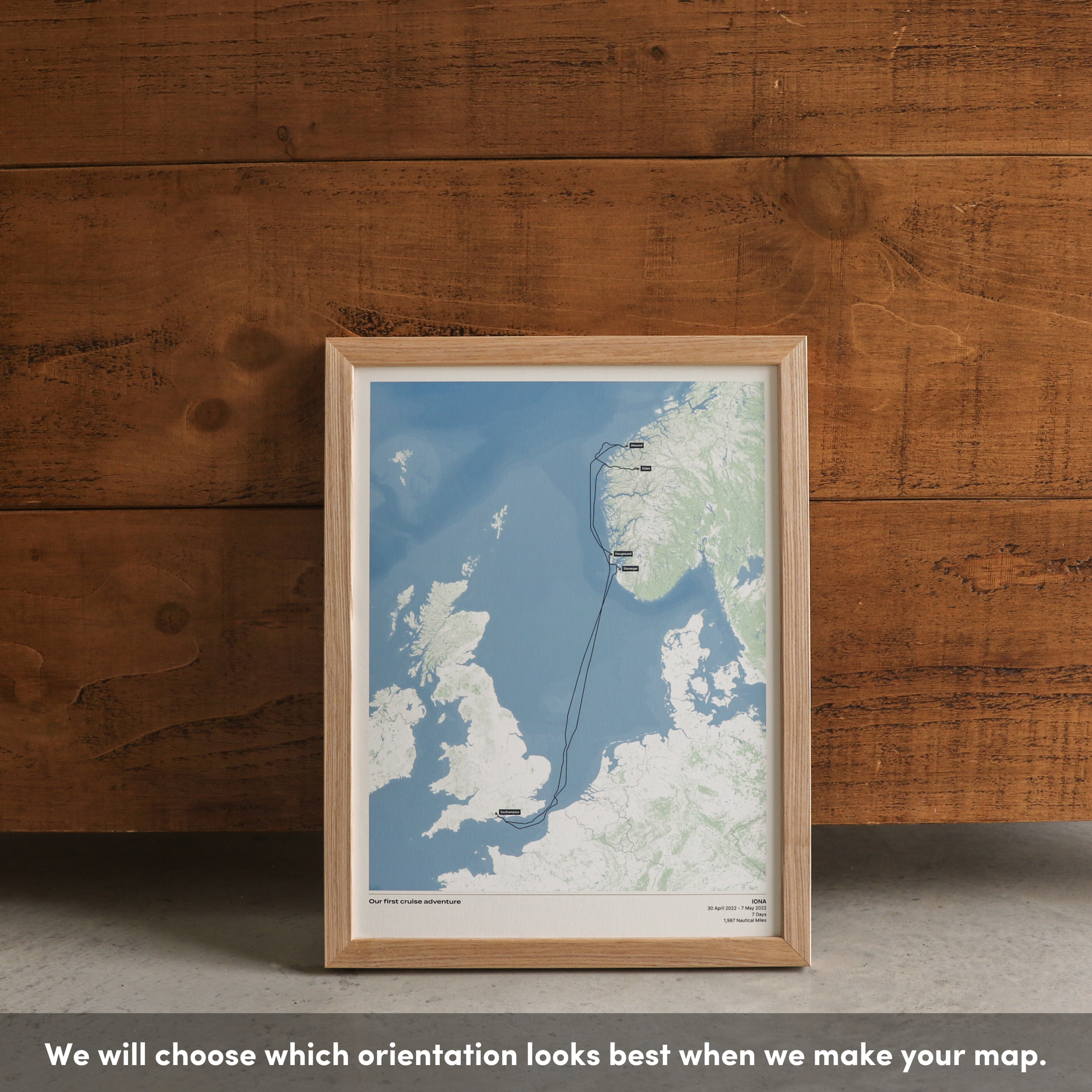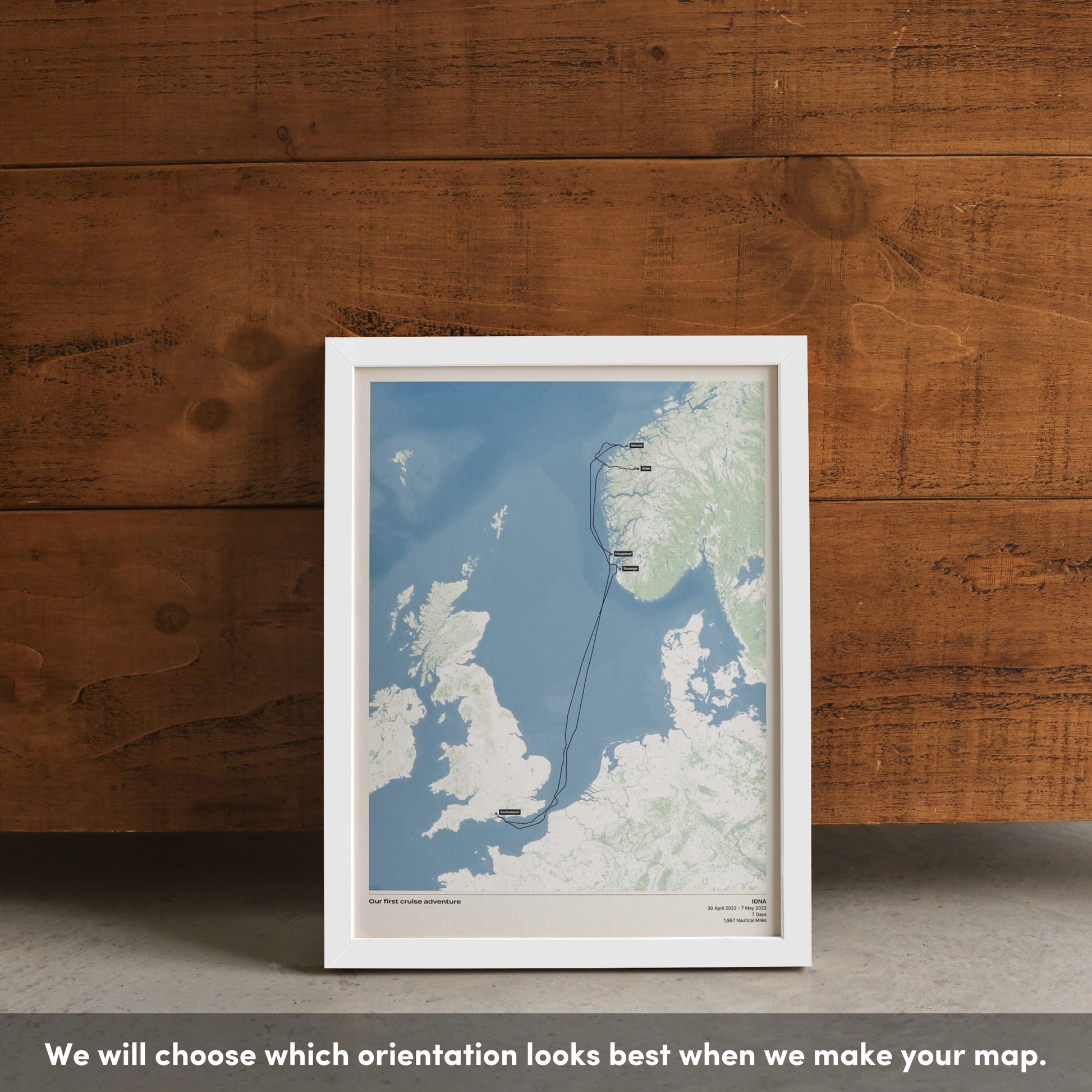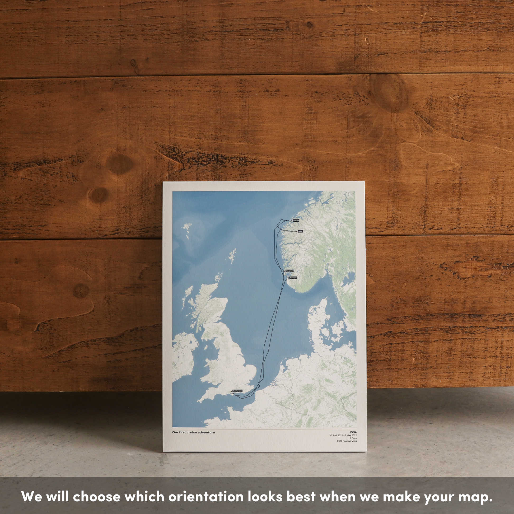 Create a beautiful customised print map of your cruise. Each map is made to order using AIS (satellite ship-tracking) data to show where you actually went, rather than just the itinerary route. Just tell us the name of your cruise ship, along with start and end points and we'll do the rest.