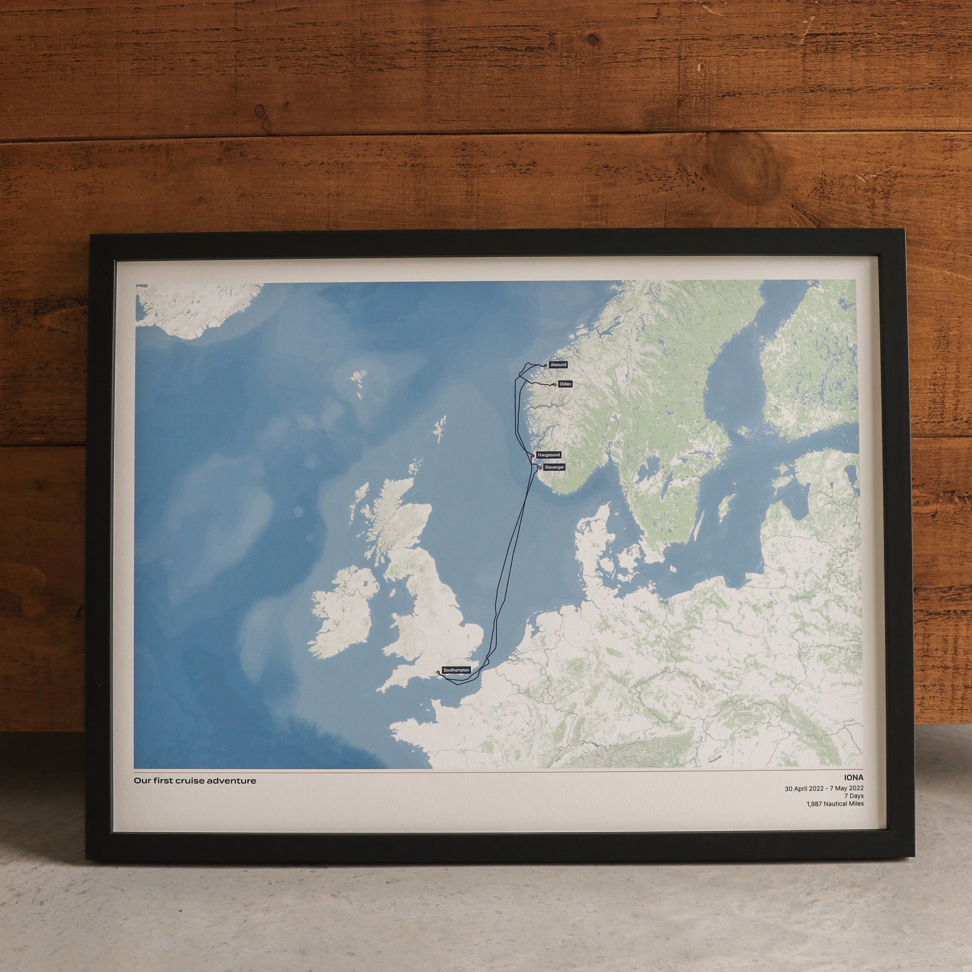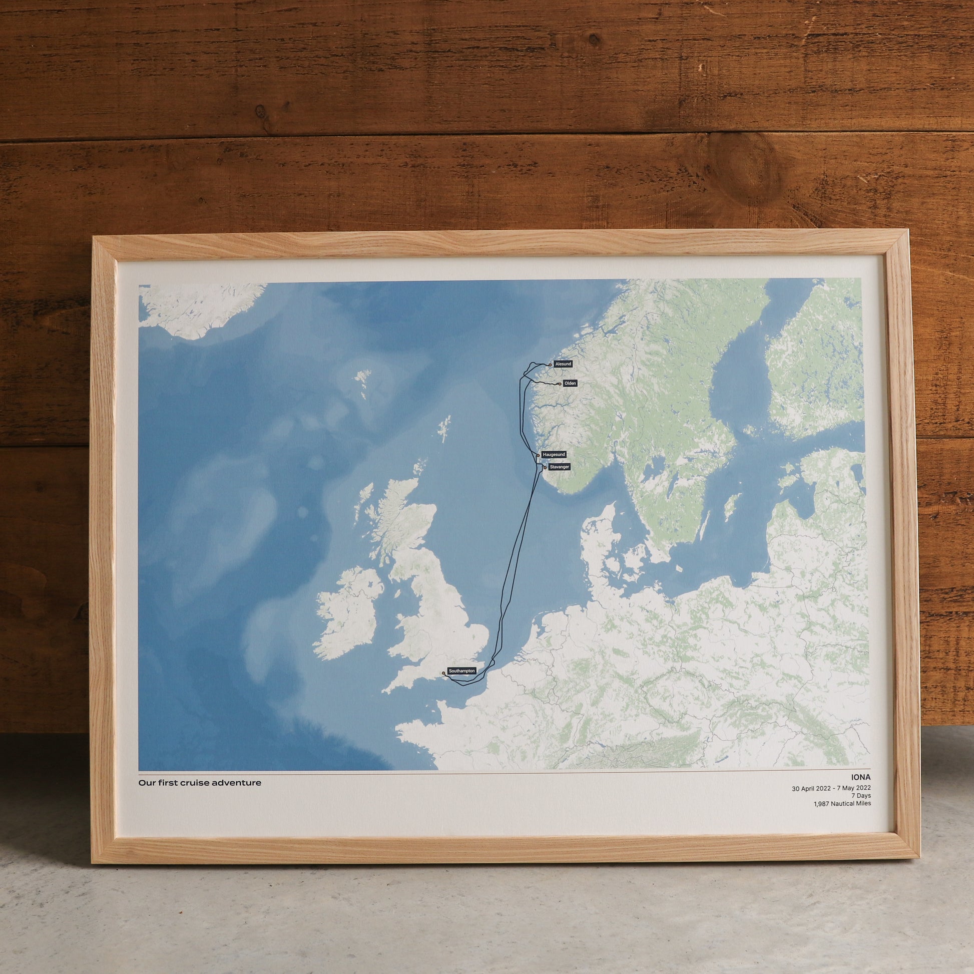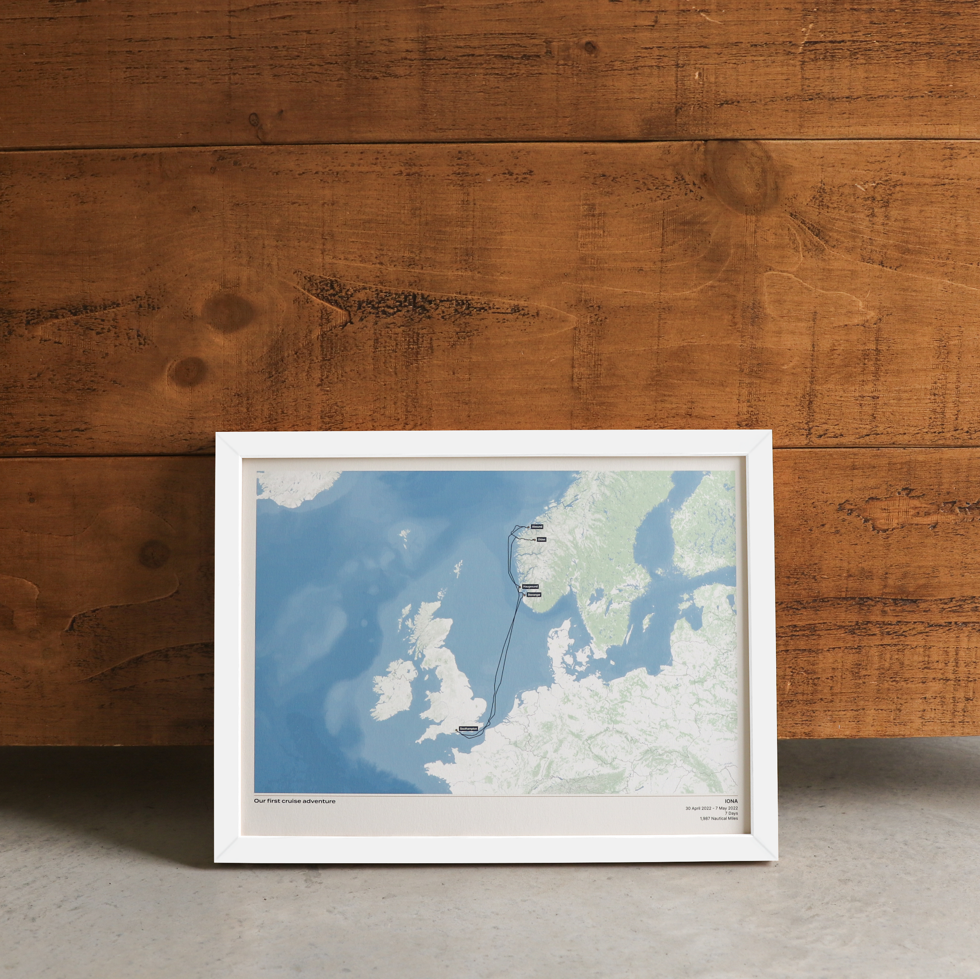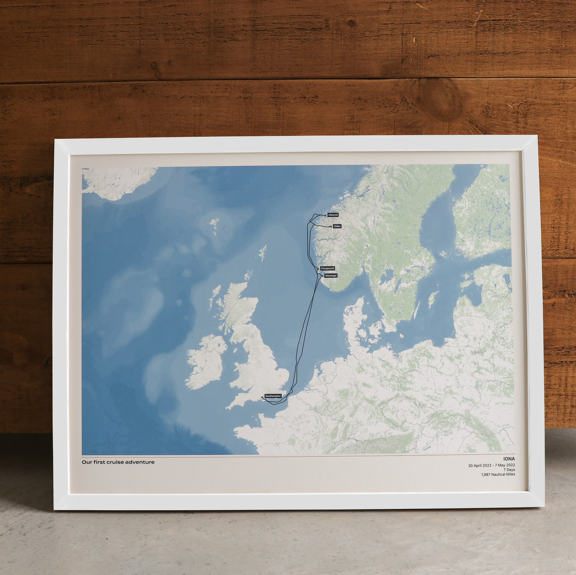 Create a beautiful customised print map of your cruise. Each map is made to order using AIS (satellite ship-tracking) data to show where you actually went, rather than just the itinerary route. Just tell us the name of your cruise ship, along with start and end points and we'll do the rest.