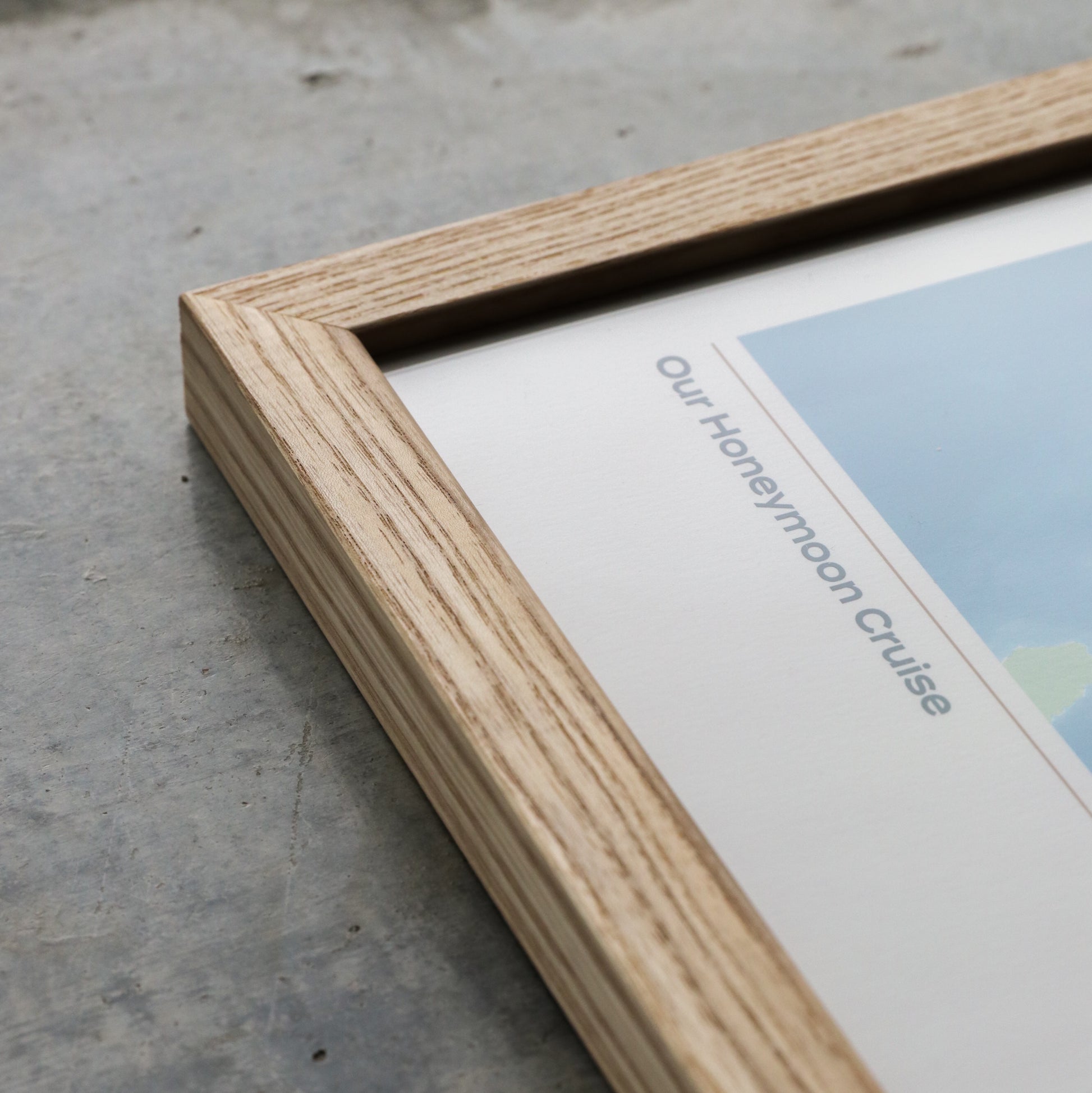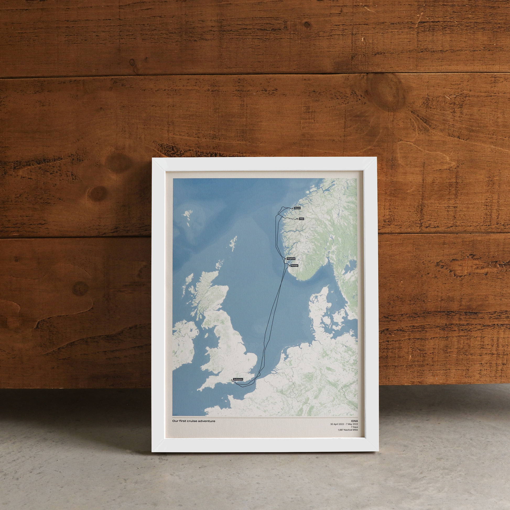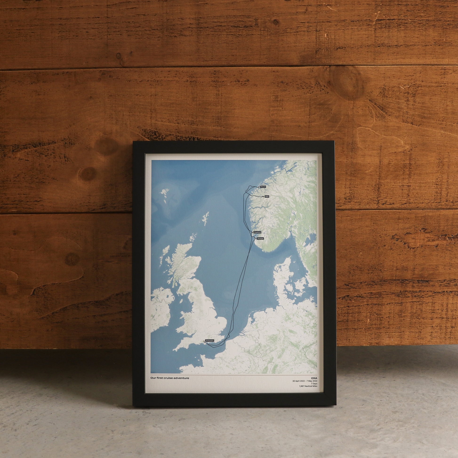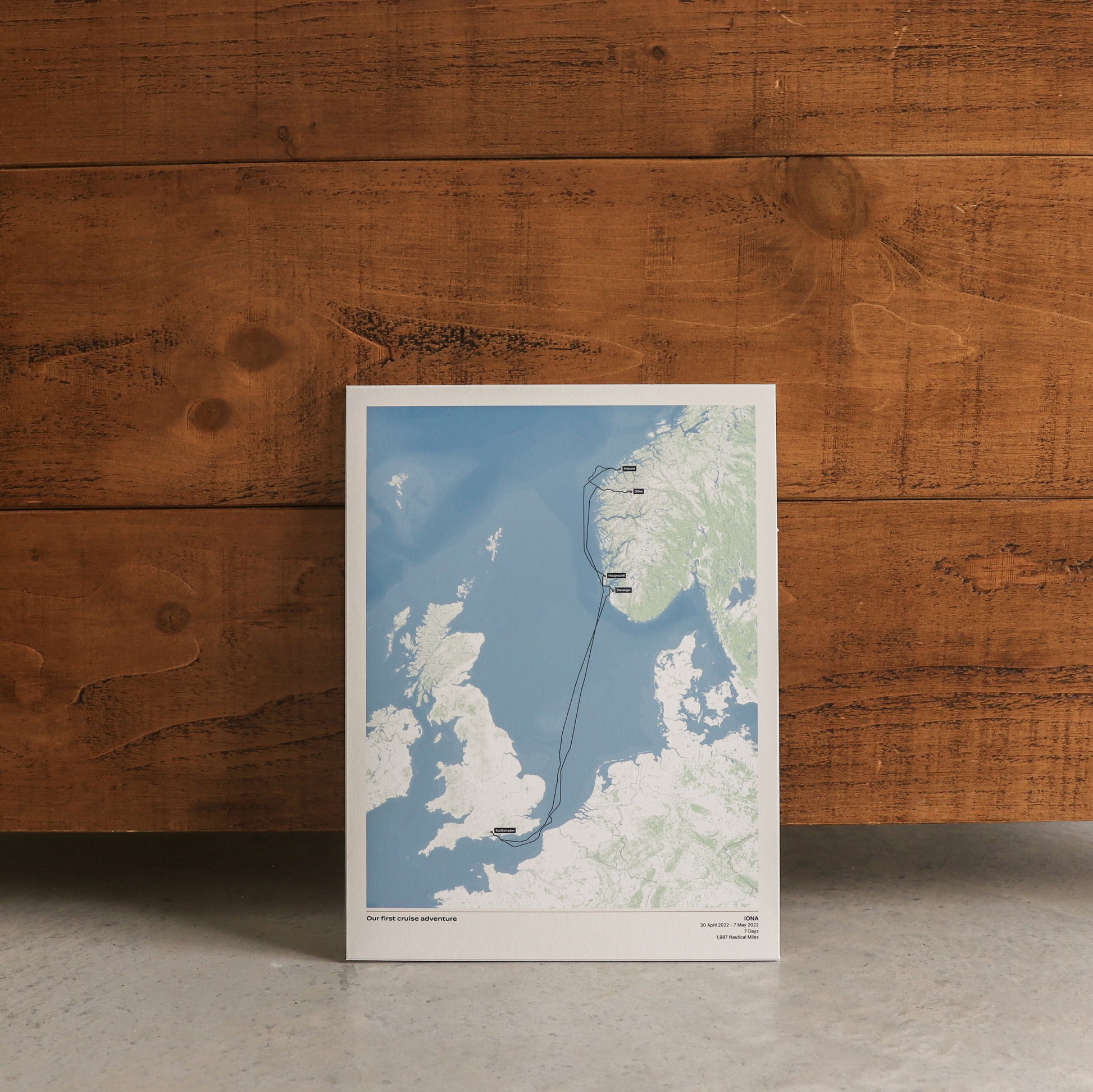 Create a beautiful customised print map of your cruise. Each map is made to order using AIS (satellite ship-tracking) data to show where you actually went, rather than just the itinerary route. Just tell us the name of your cruise ship, along with start and end points and we'll do the rest.