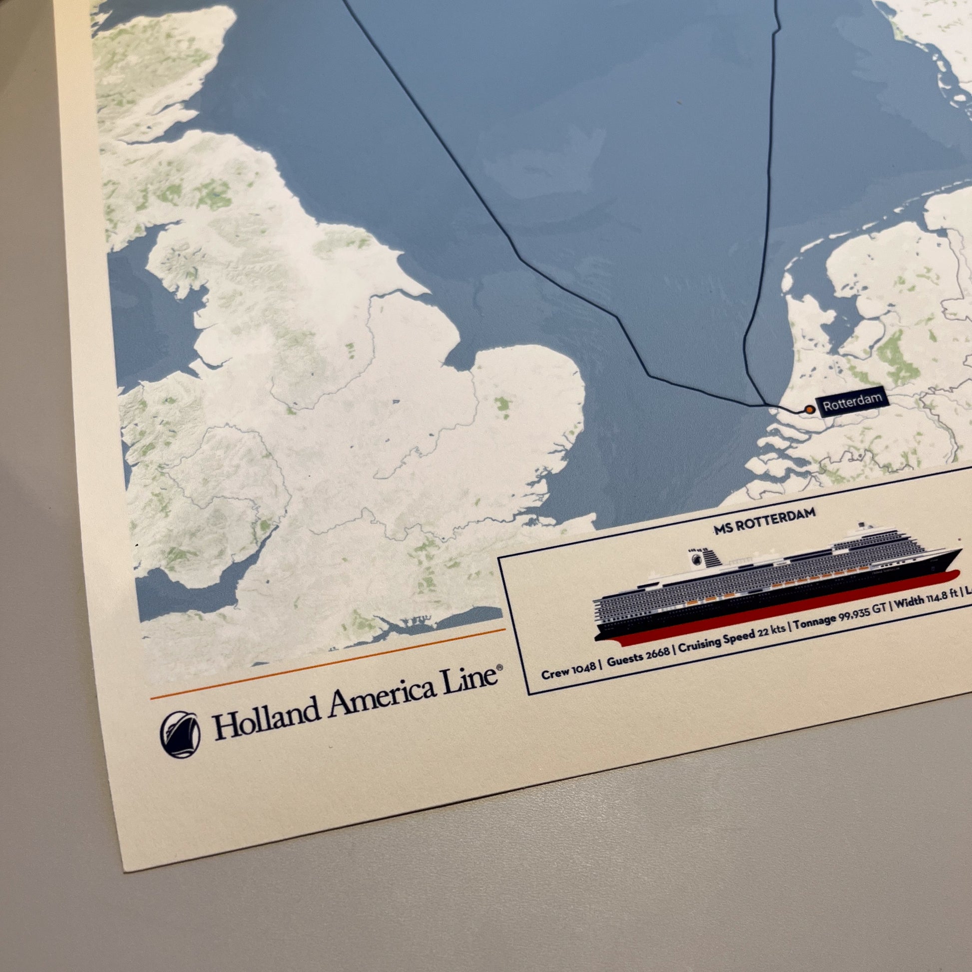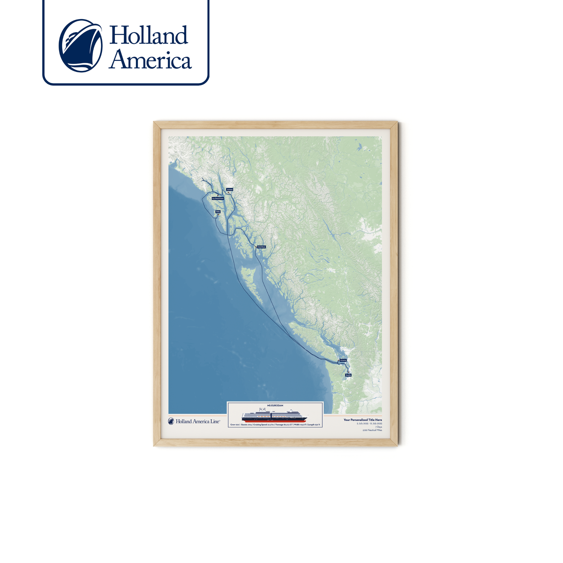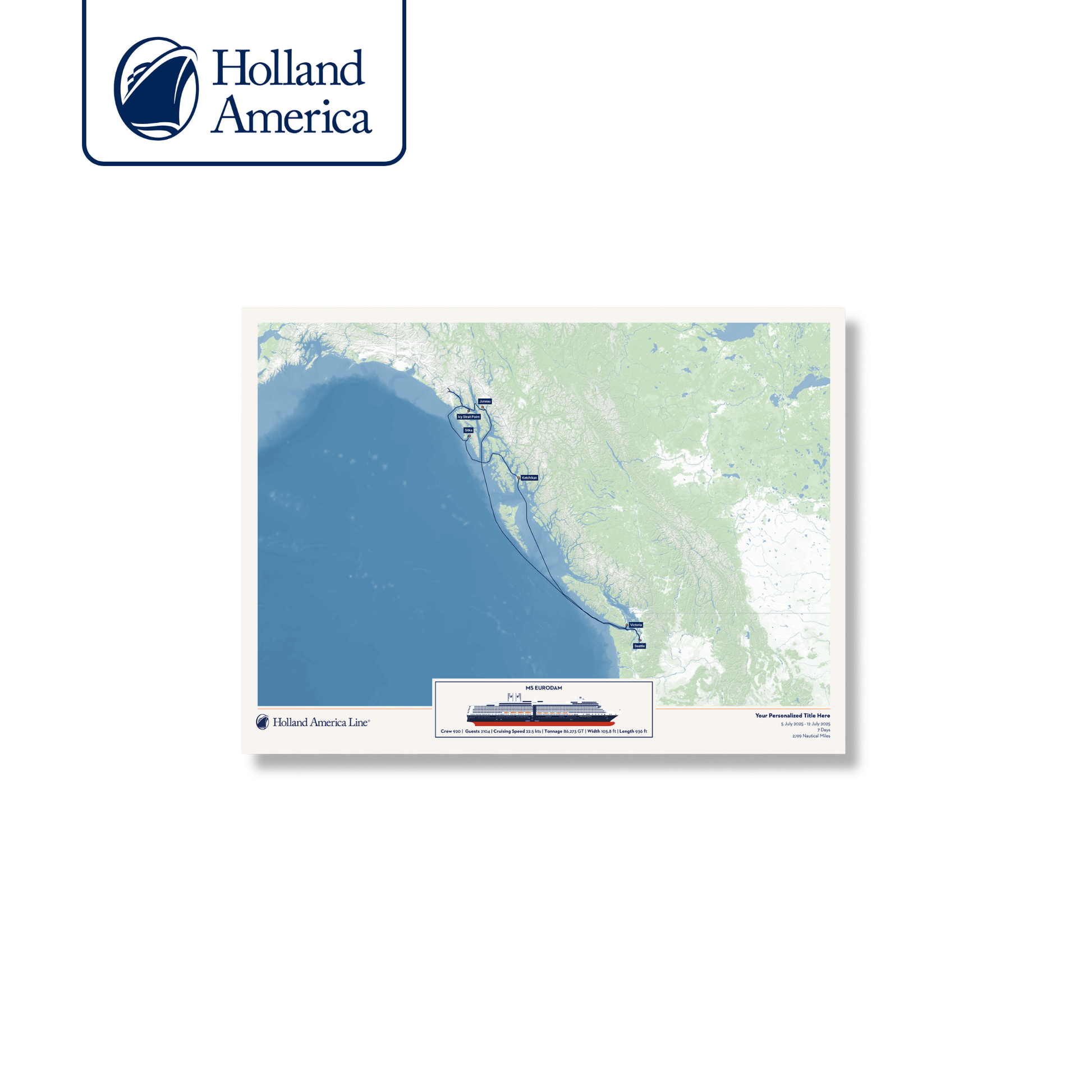 Create a beautiful customised print map of your exact Holland America cruise. Each map is made to order using AIS (satellite ship-tracking) data to show where you actually went, rather than just the itinerary route. Select your Holland America ship along with embarkation and disembarkation points and we'll do the rest.