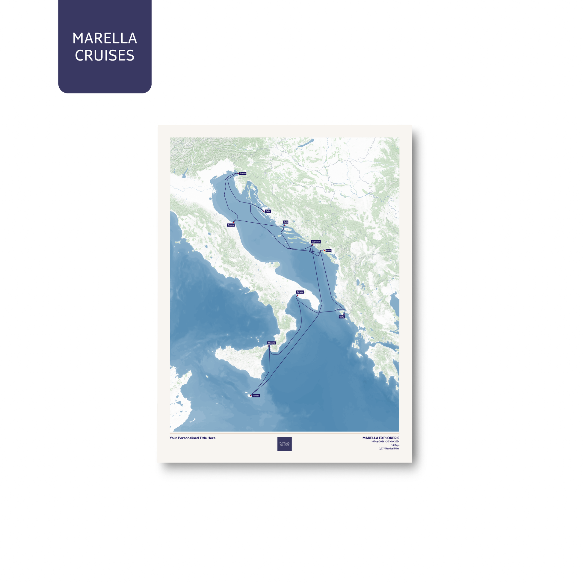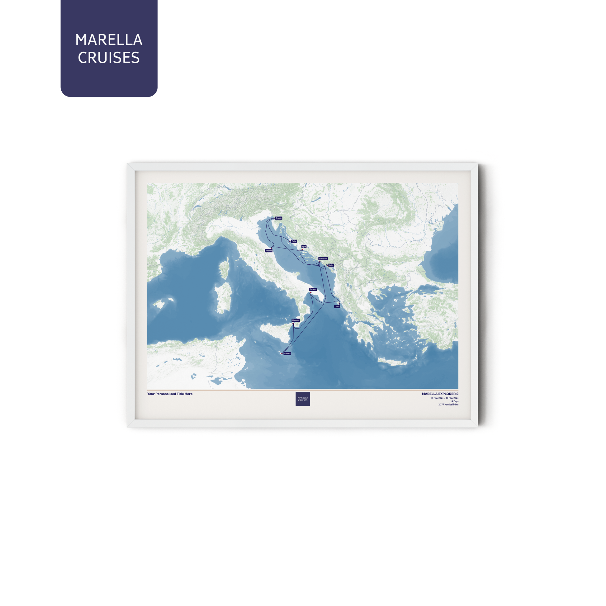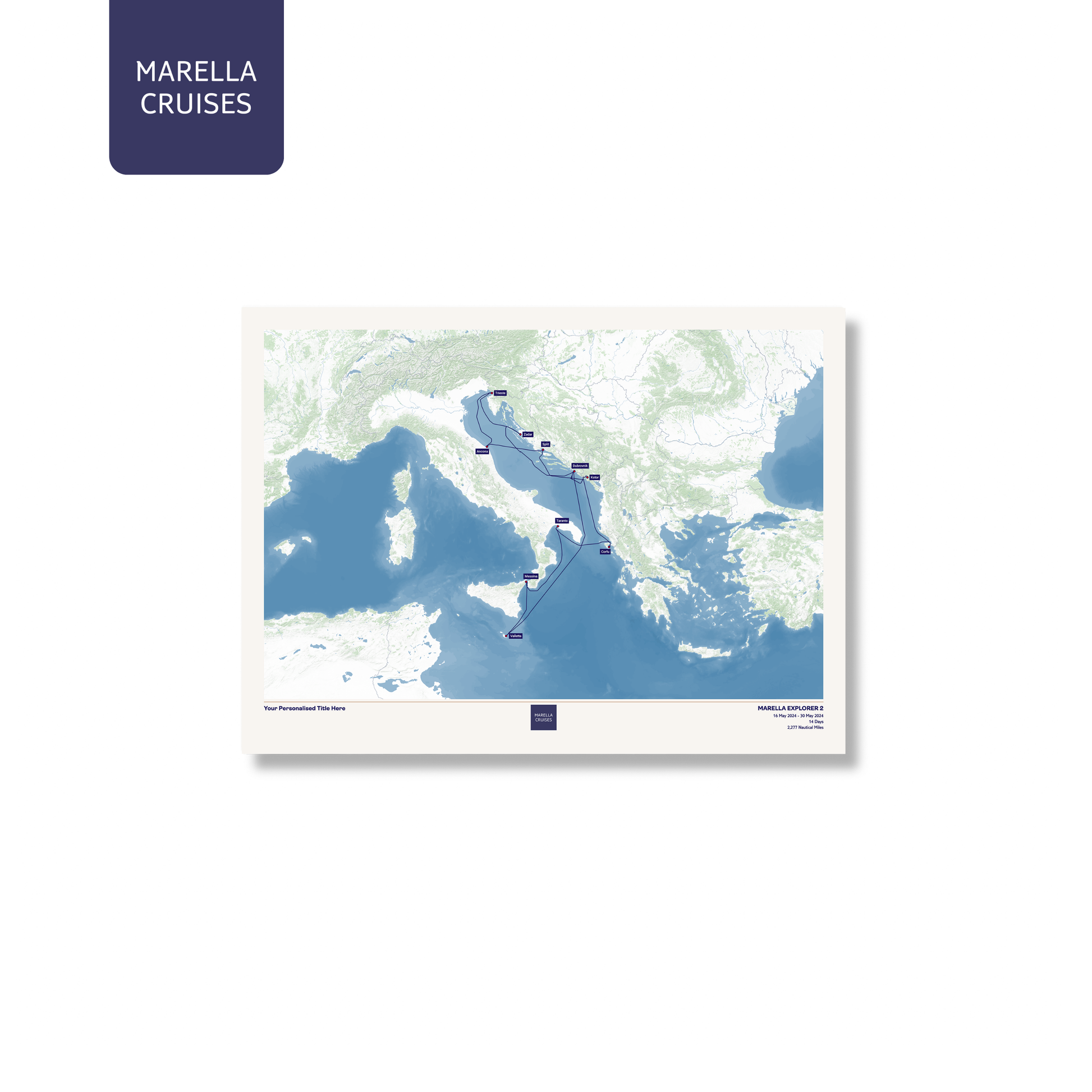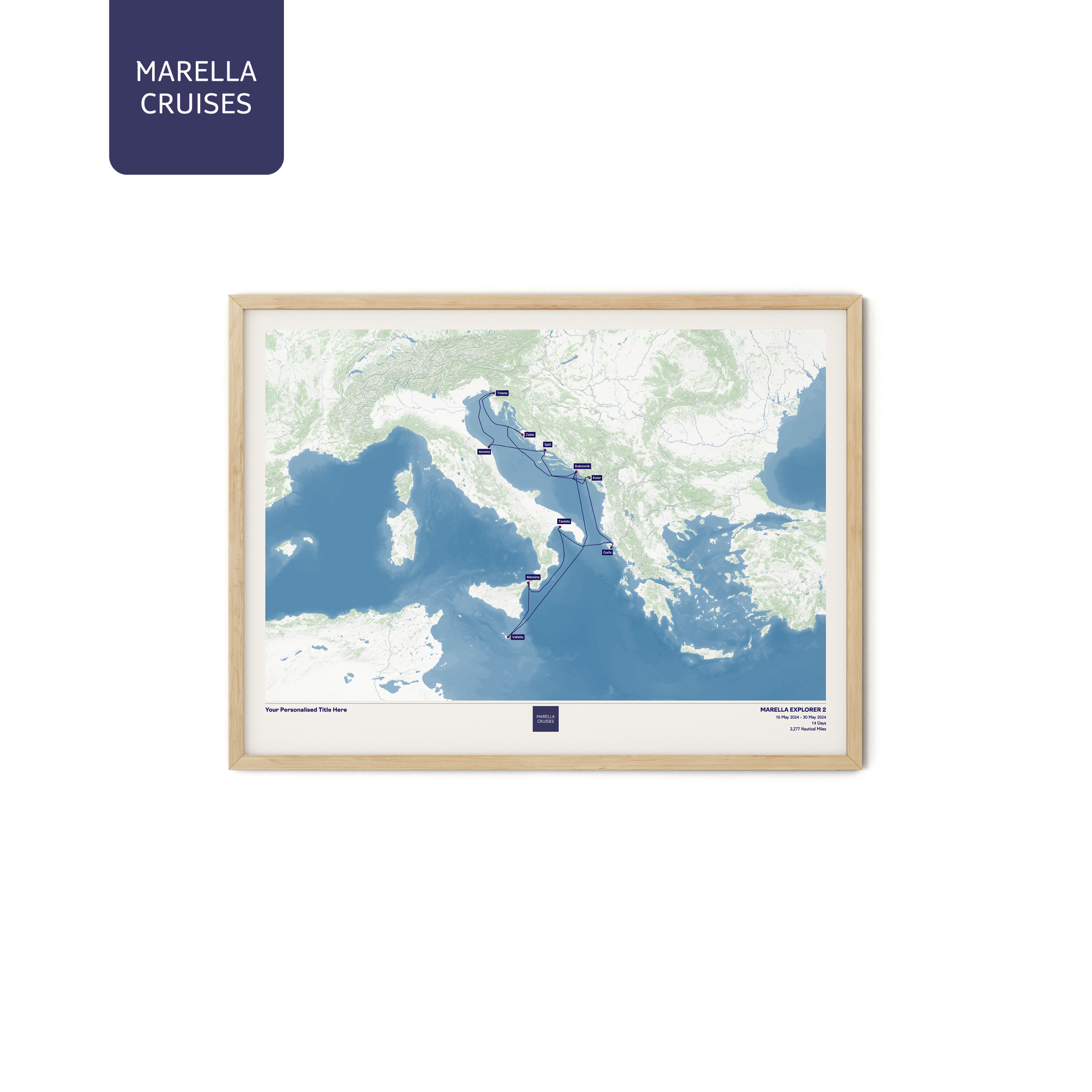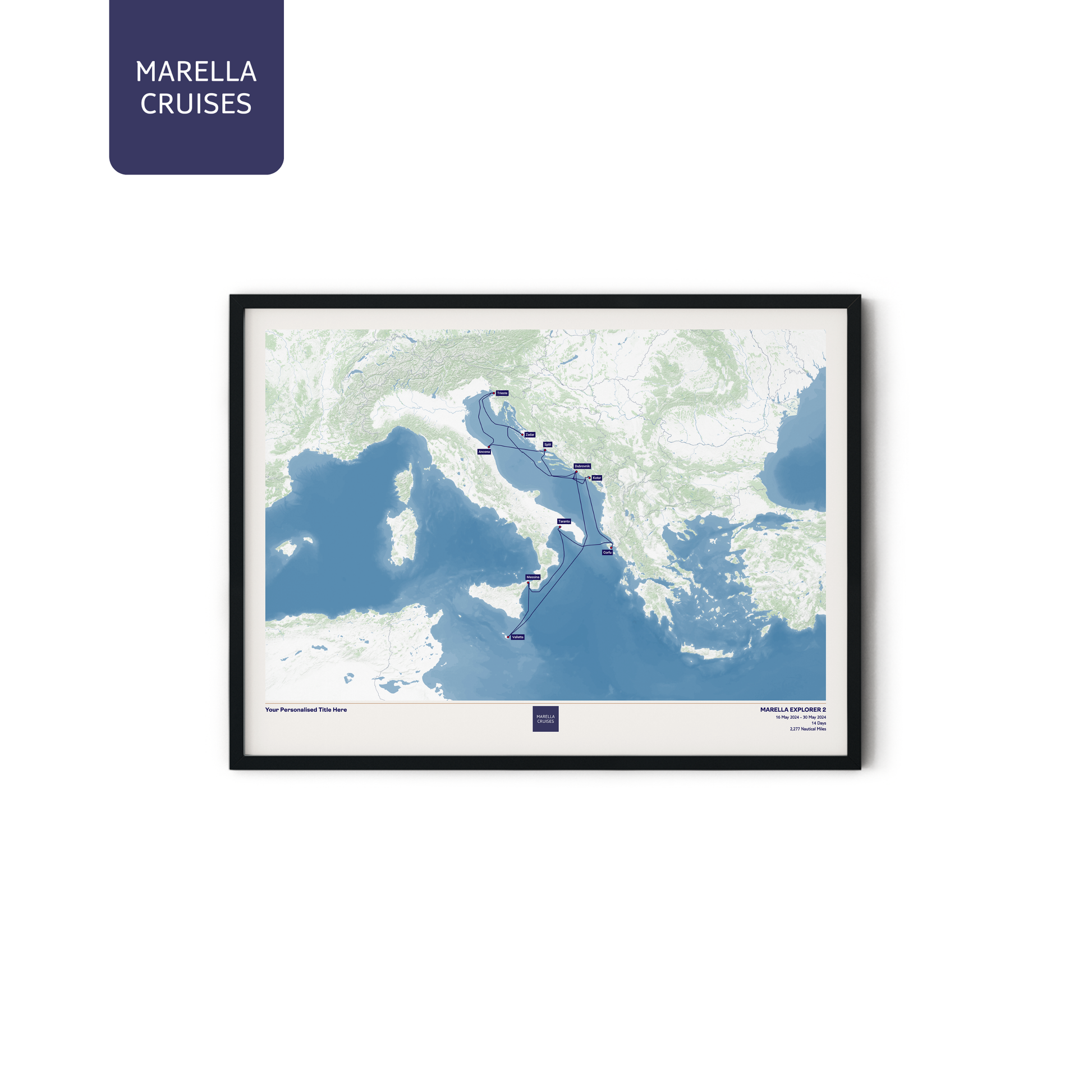 Create a beautiful customised print map of your exact Marella cruise. Each map is made to order using AIS (satellite ship-tracking) data to show where you actually went, rather than just the itinerary route. Select your Marella ship along with embarkation and disembarkation points and we'll do the rest.