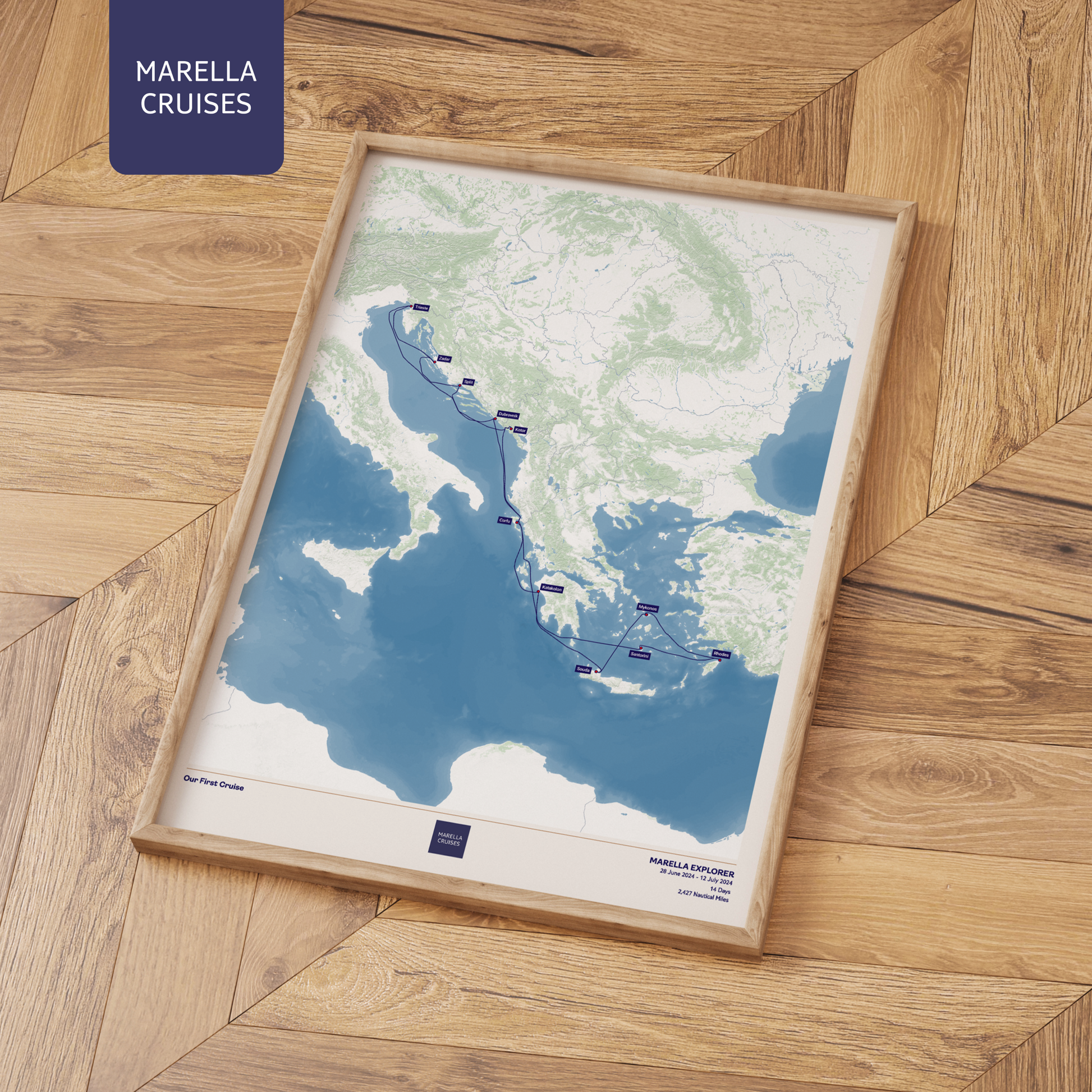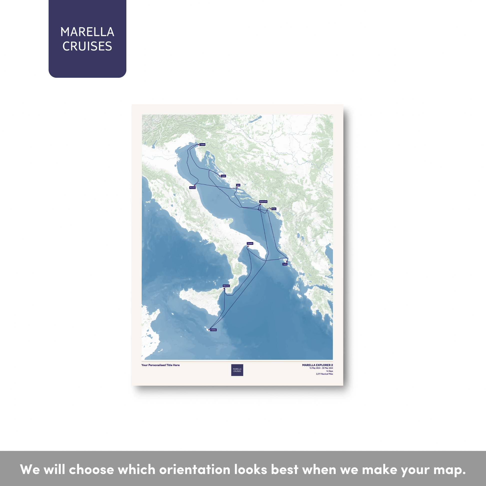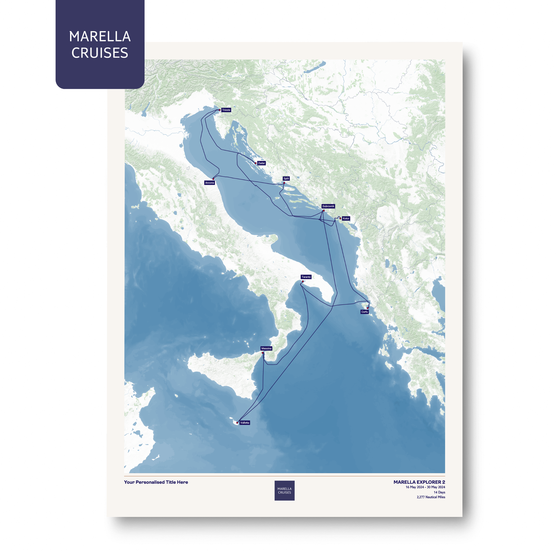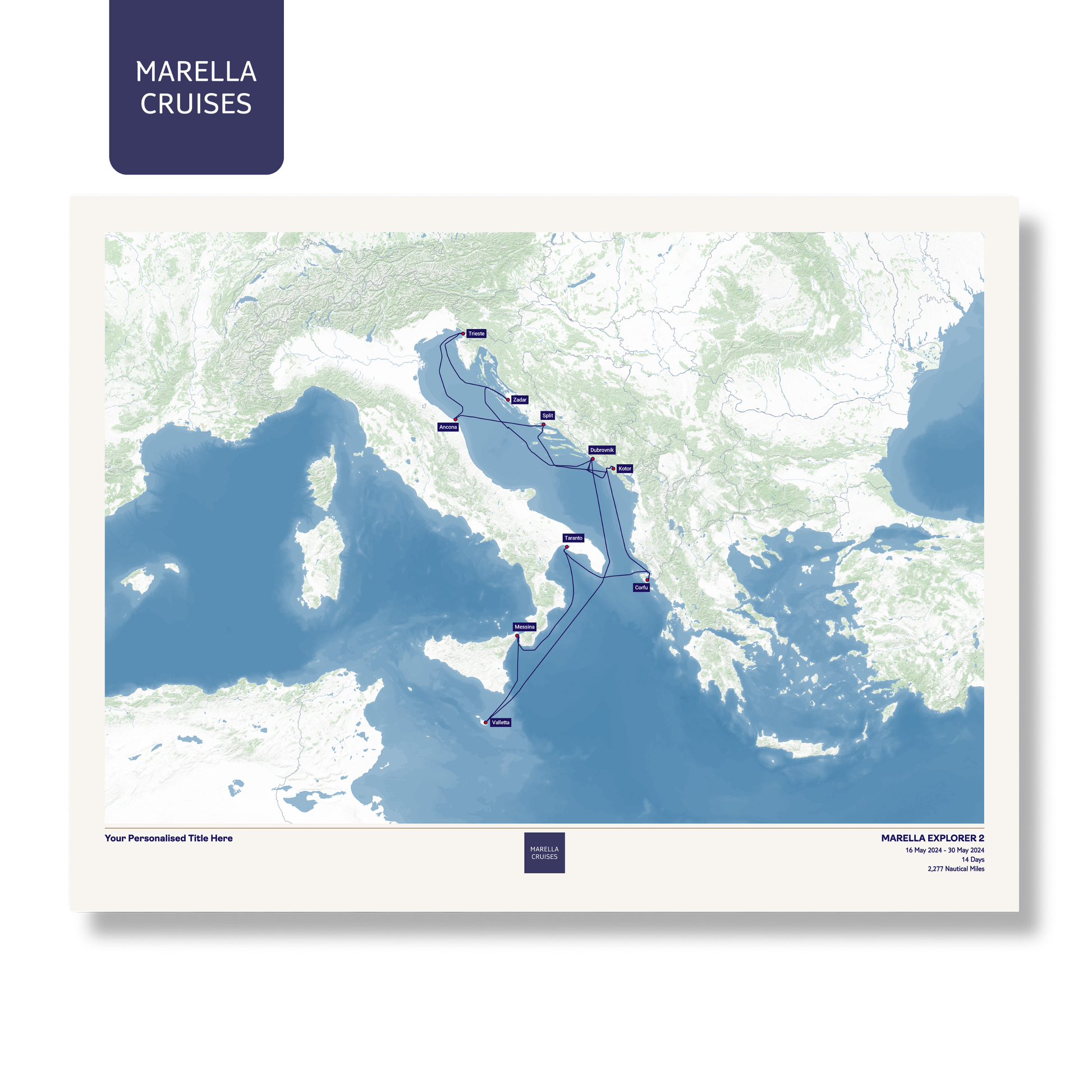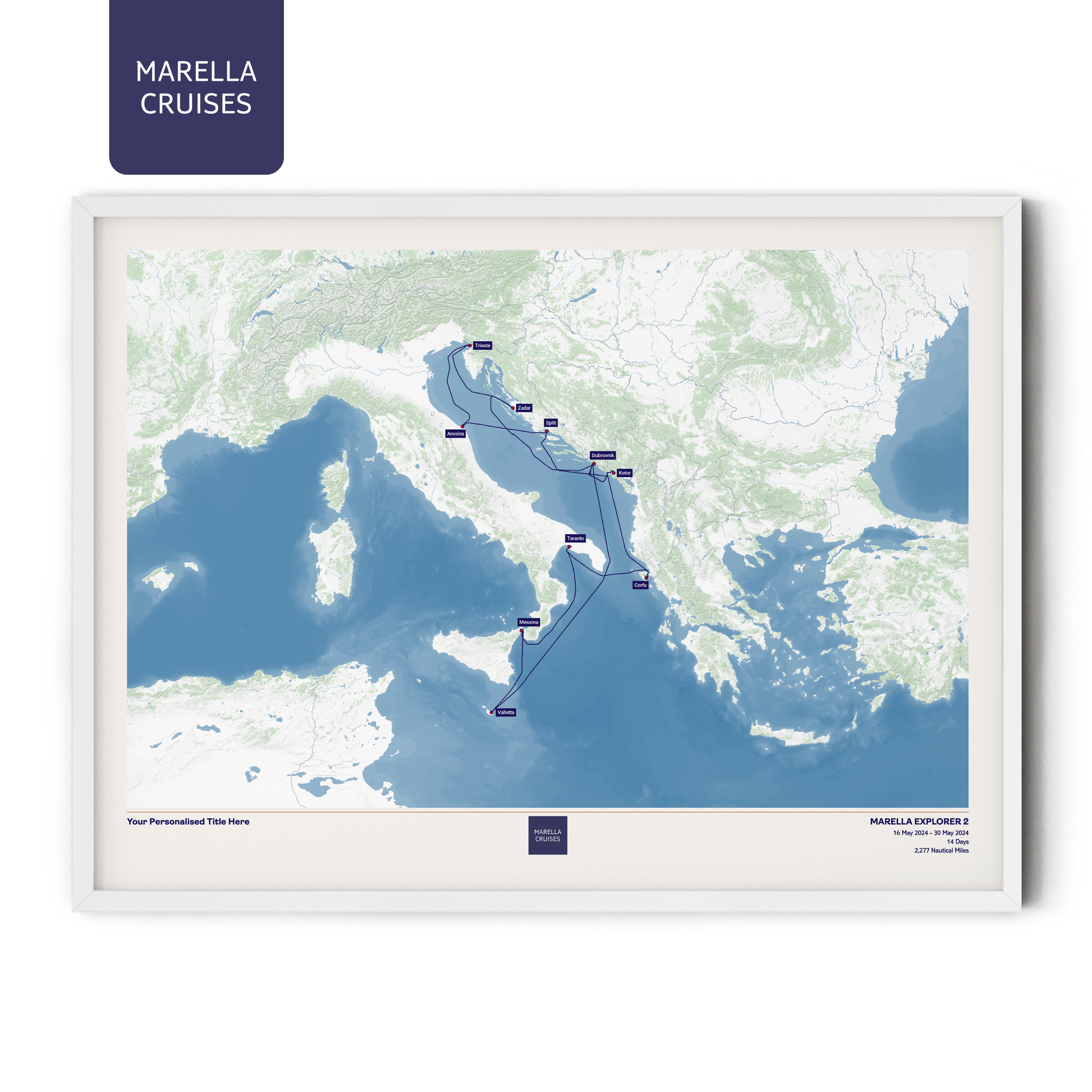Create a beautiful customised print map of your exact Marella cruise. Each map is made to order using AIS (satellite ship-tracking) data to show where you actually went, rather than just the itinerary route. Select your Marella ship along with embarkation and disembarkation points and we'll do the rest.