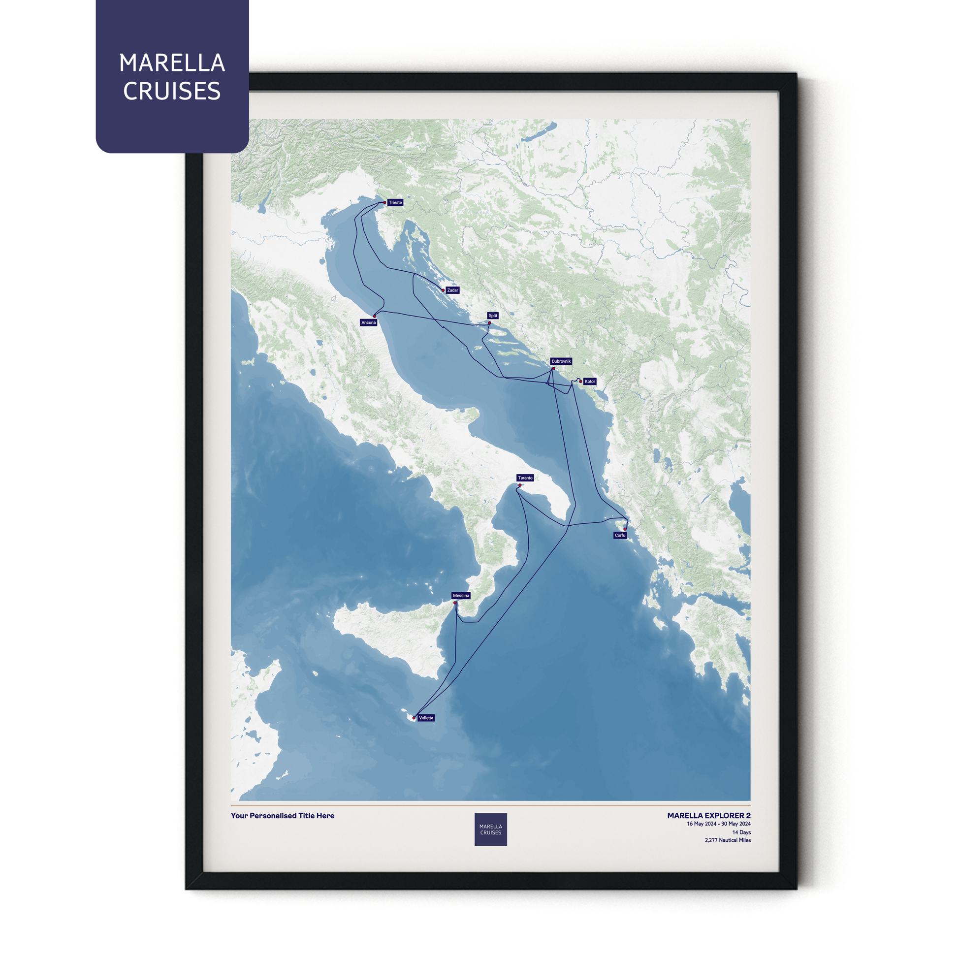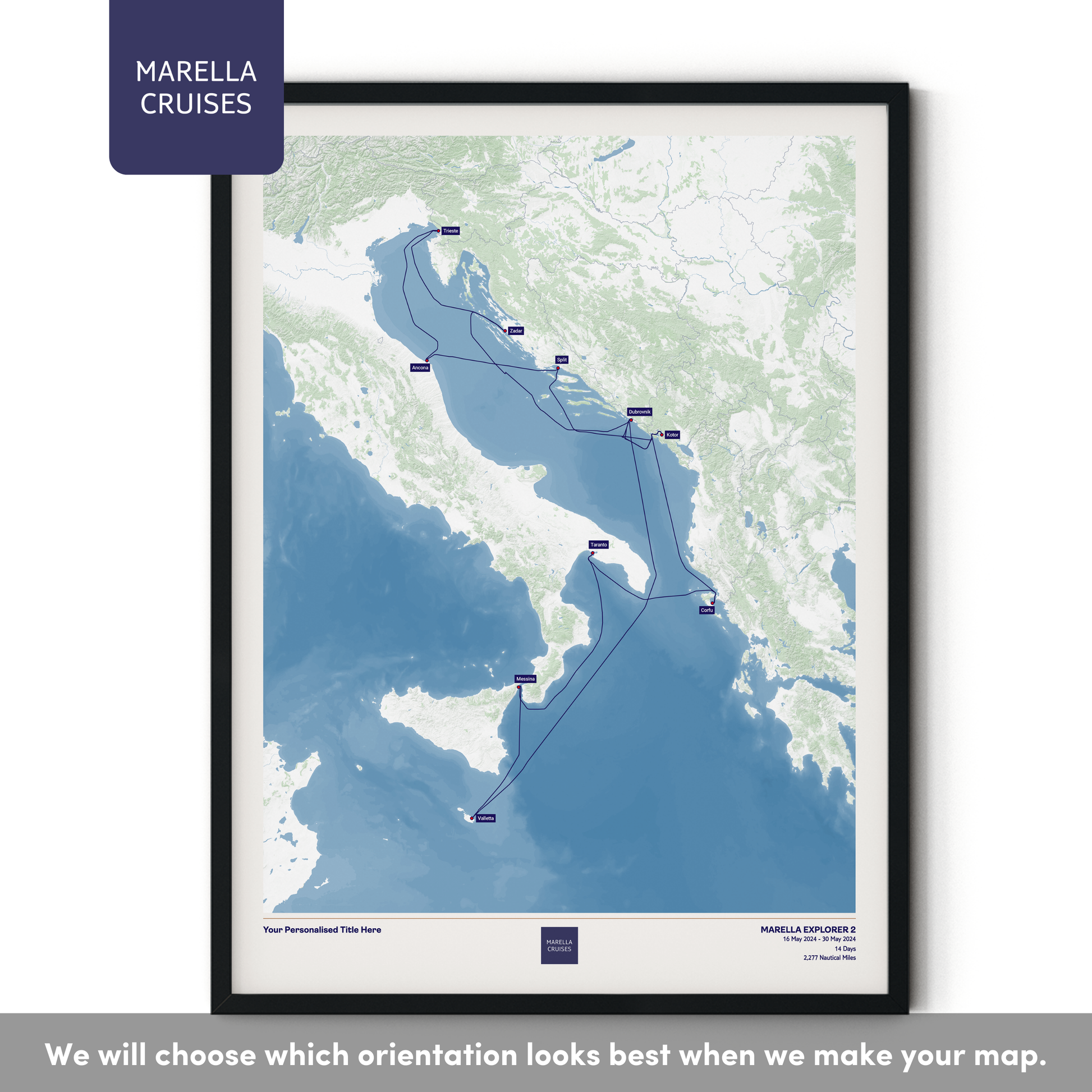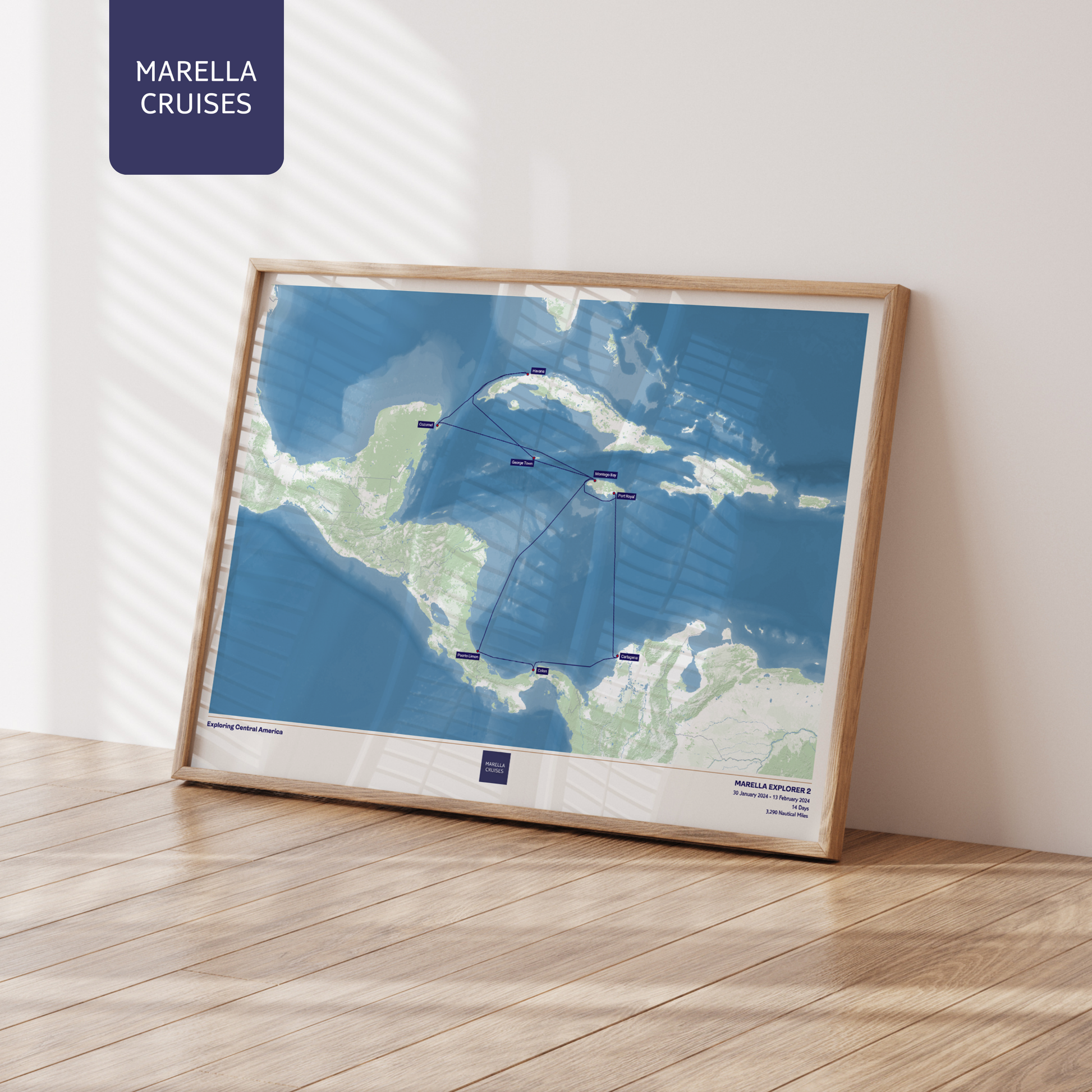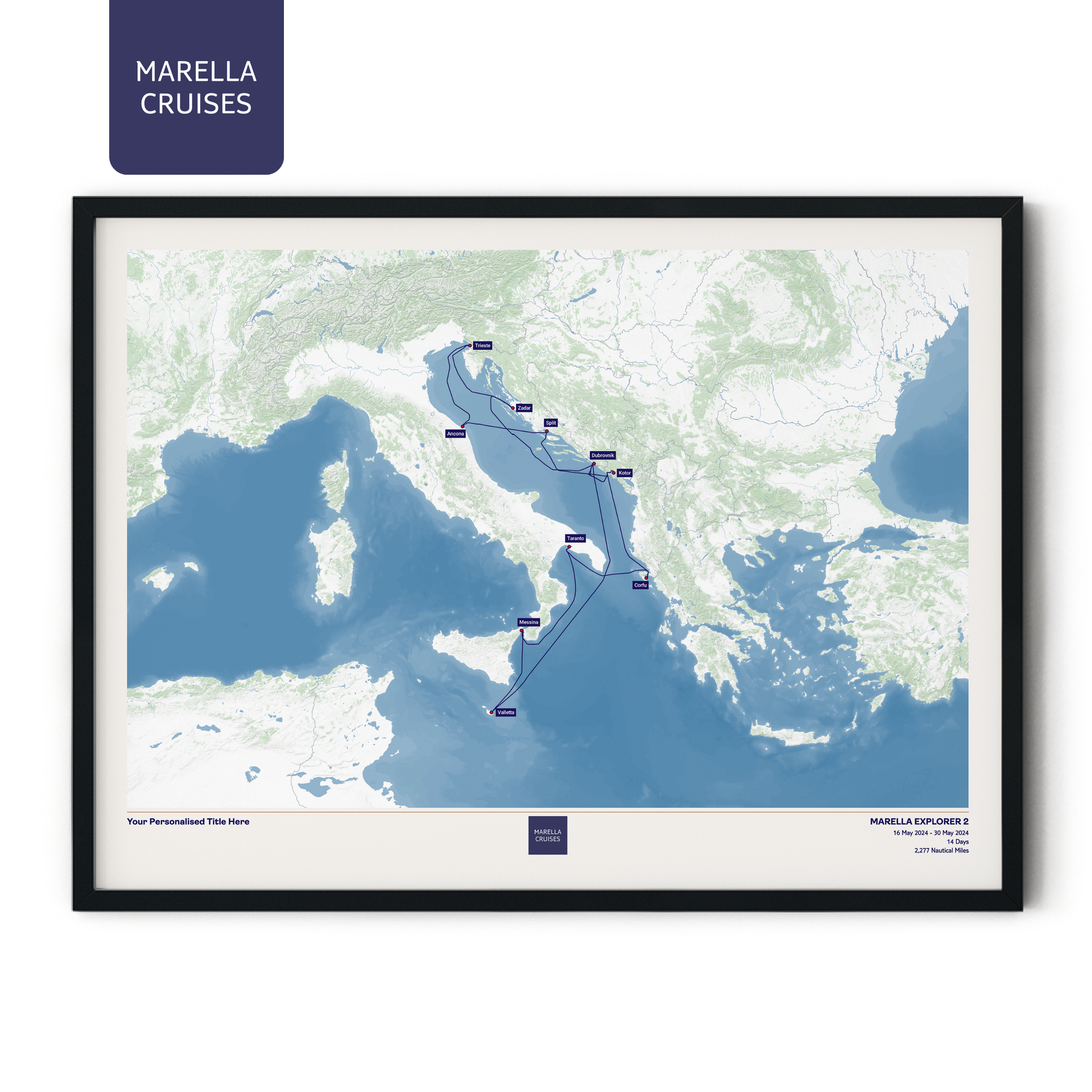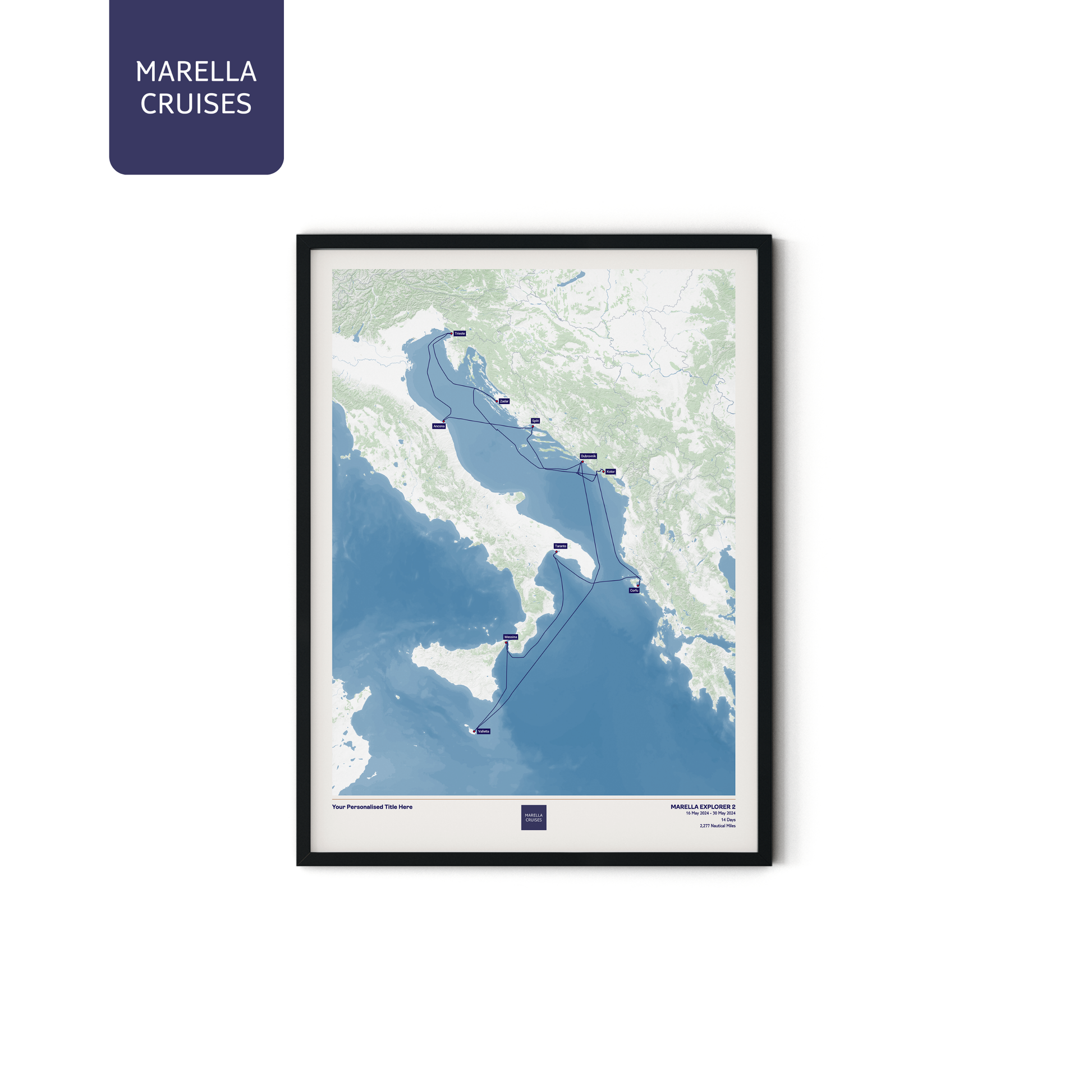 Create a beautiful customised print map of your exact Marella cruise. Each map is made to order using AIS (satellite ship-tracking) data to show where you actually went, rather than just the itinerary route. Select your Marella ship along with embarkation and disembarkation points and we'll do the rest.