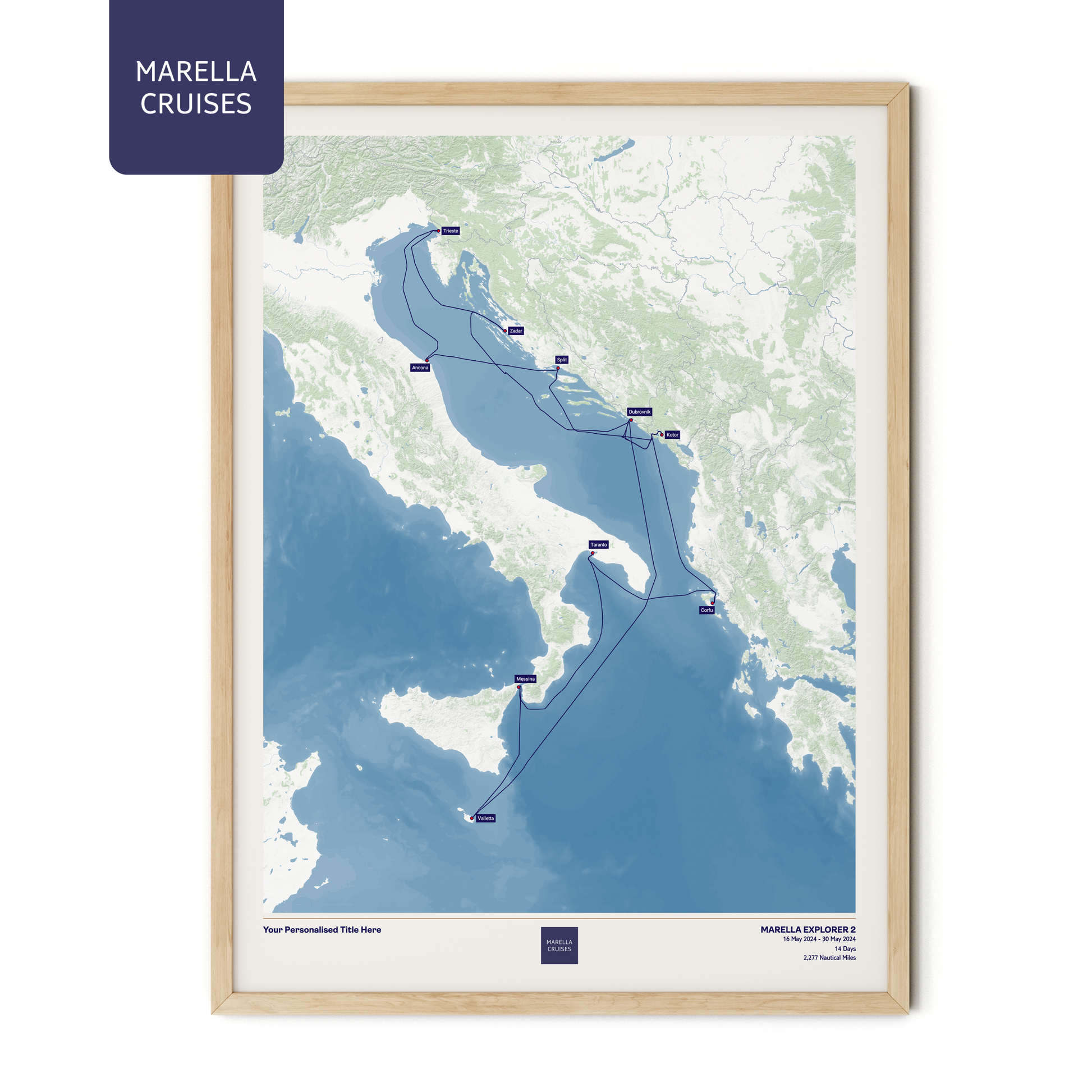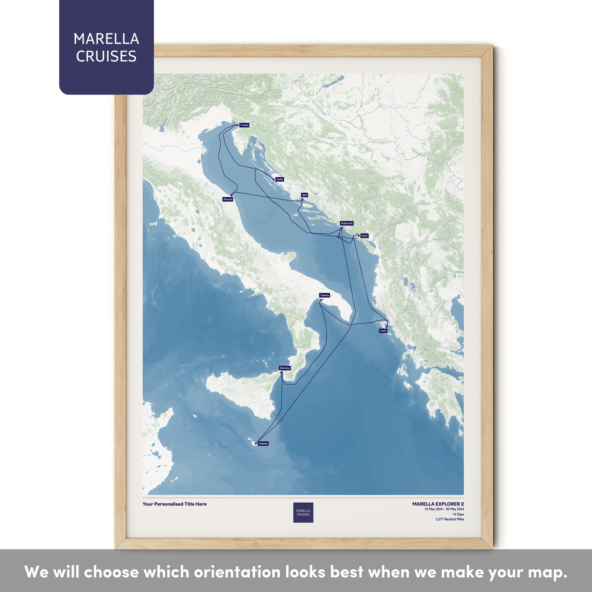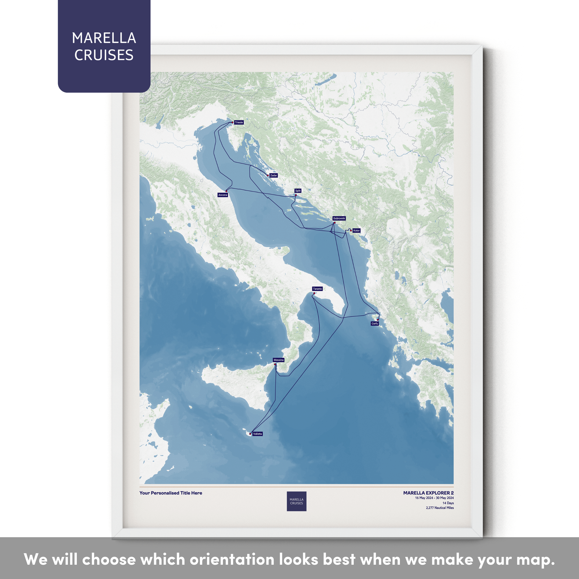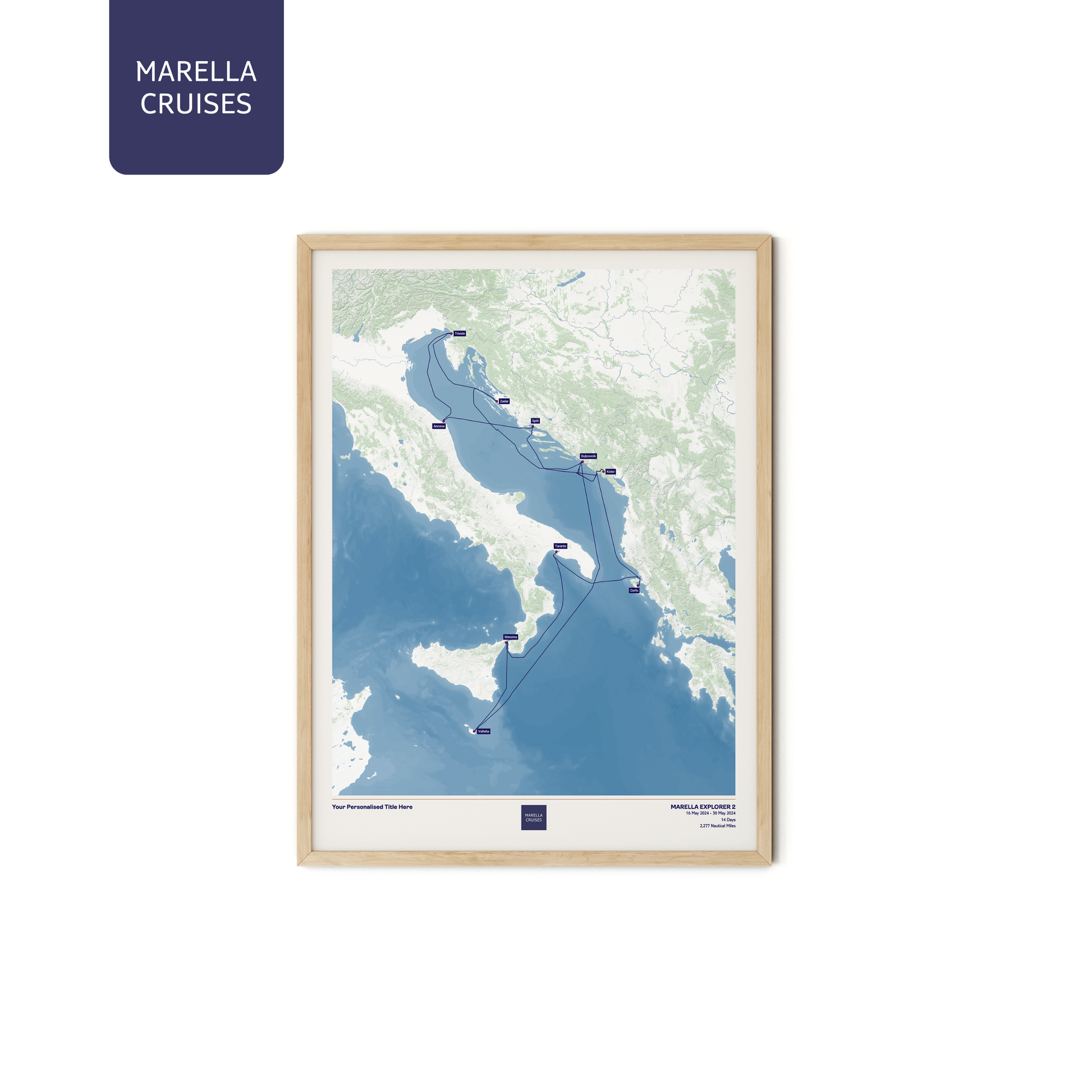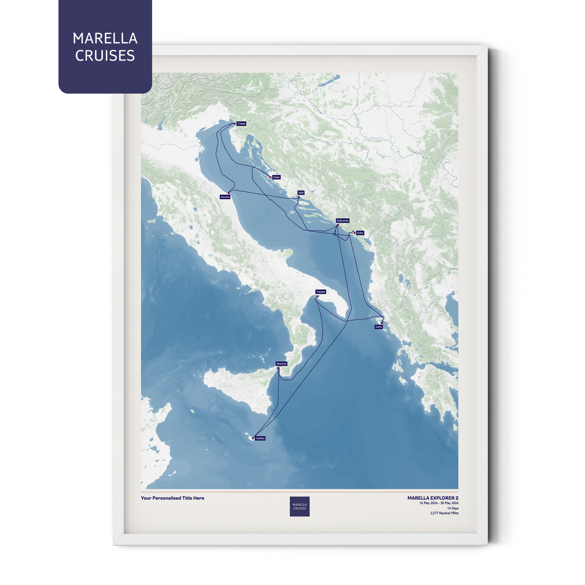 Create a beautiful customised print map of your exact Marella cruise. Each map is made to order using AIS (satellite ship-tracking) data to show where you actually went, rather than just the itinerary route. Select your Marella ship along with embarkation and disembarkation points and we'll do the rest.