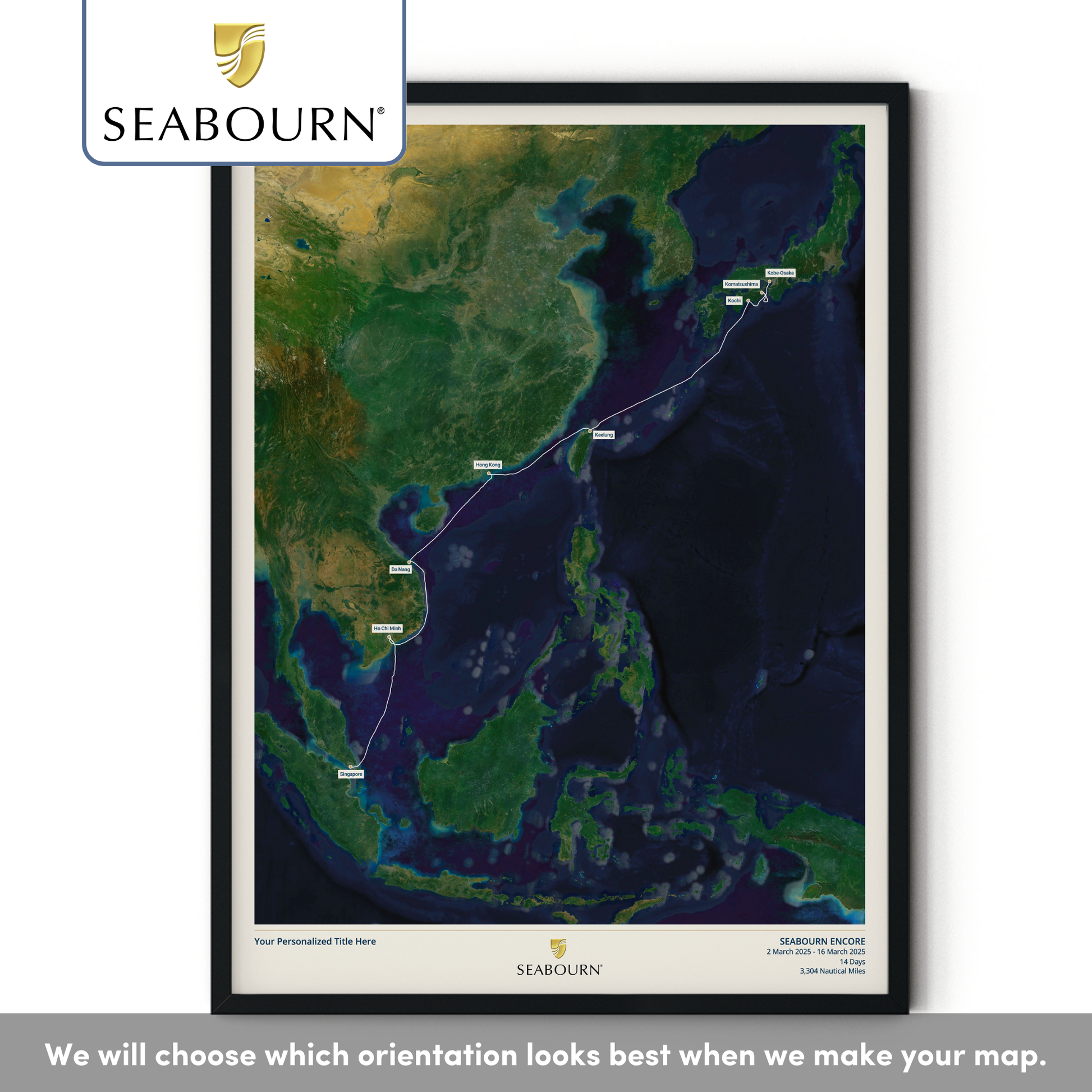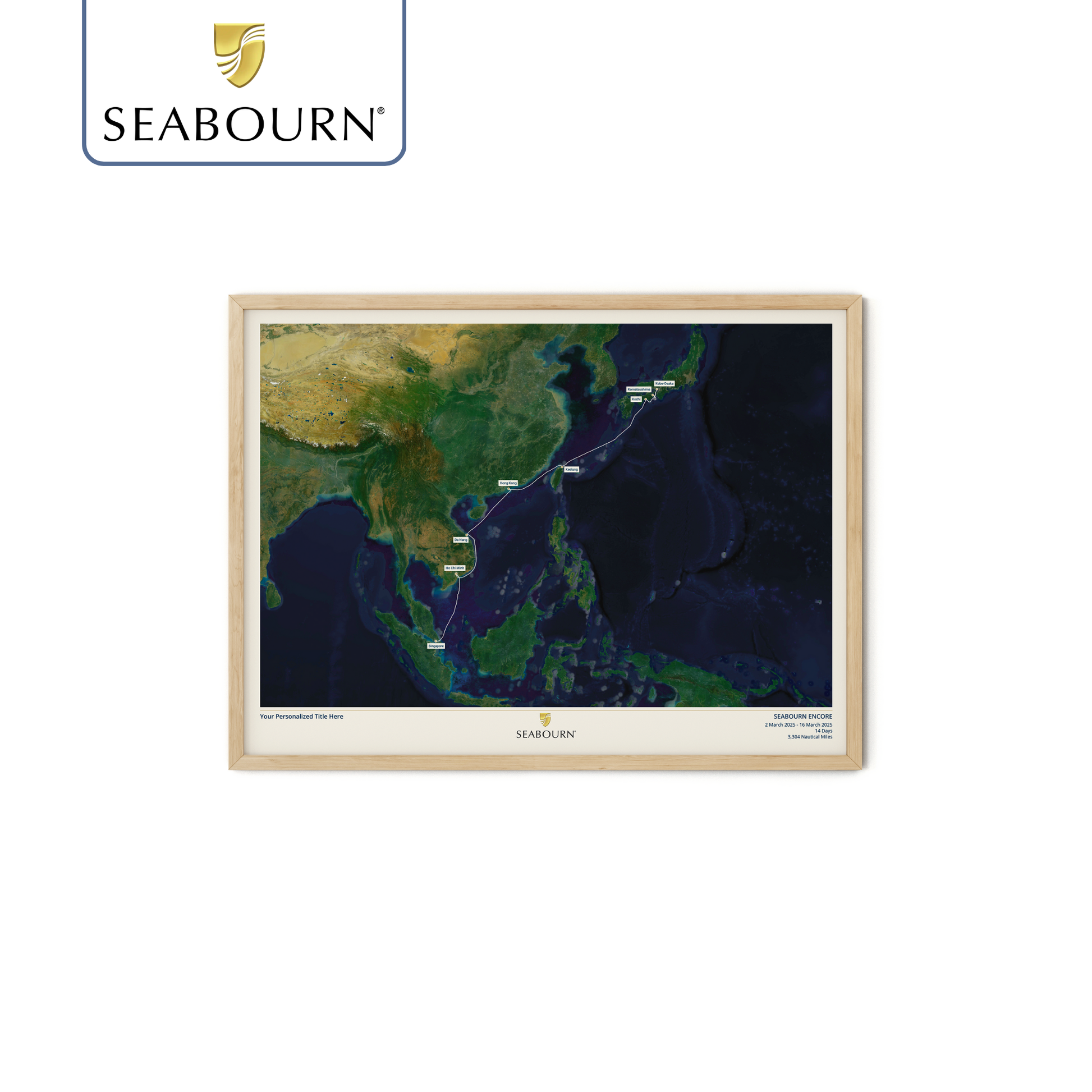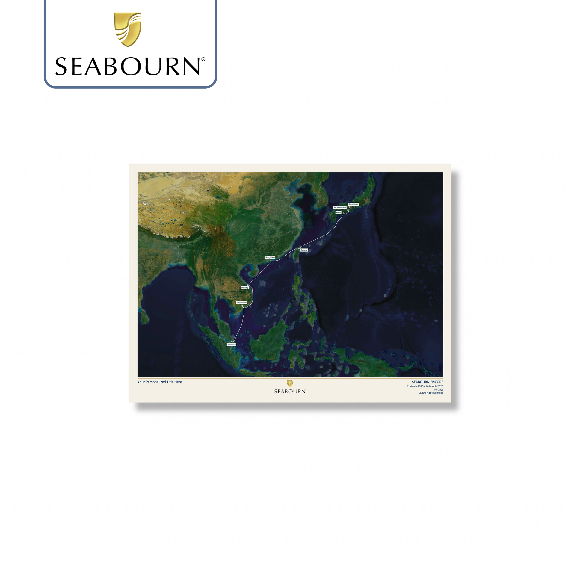 Create a beautiful customised print map of your exact Seabourn cruise. Each map is made to order using AIS (satellite ship-tracking) data to show where you actually went, rather than just the itinerary route. Select your Seabourn ship along with embarkation and disembarkation points and we'll do the rest.