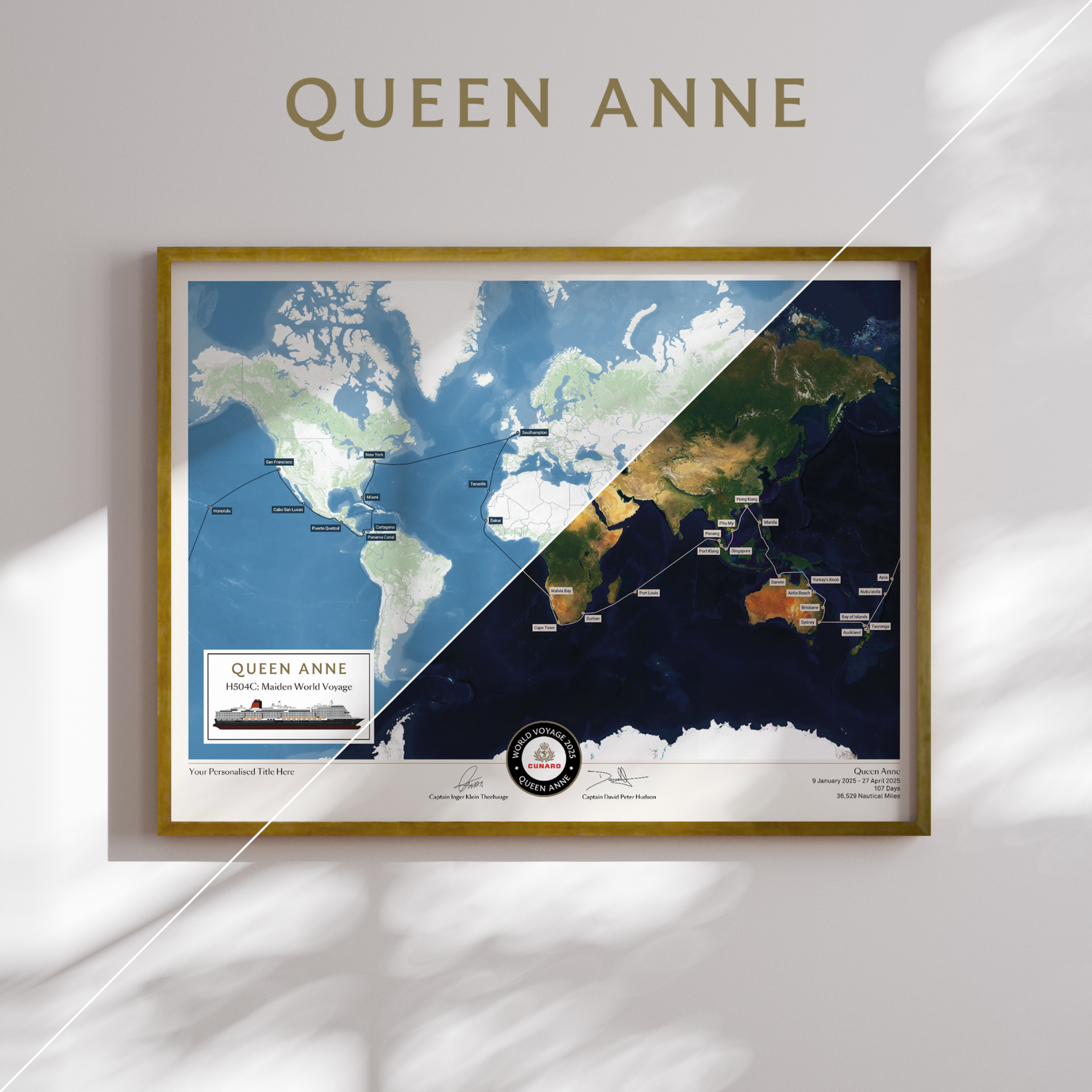 Celebrate the South America Discovery voyage on Queen Victoria, with this Special Edition printed map. Created using AIS (satellite ship-tracking) data, this map will show the exact route taken. This Special Edition design features an exclusive voyage-specific inlay, Cunard's official Queen Victoria ship profile, and Captains' signatures. Simply give your map a personalised title, and we'll do the rest.