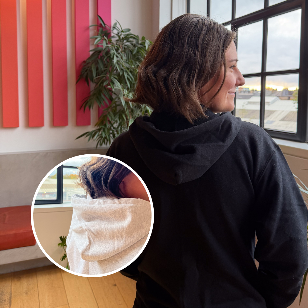 - Features a double-lined hood with matching drawstring.